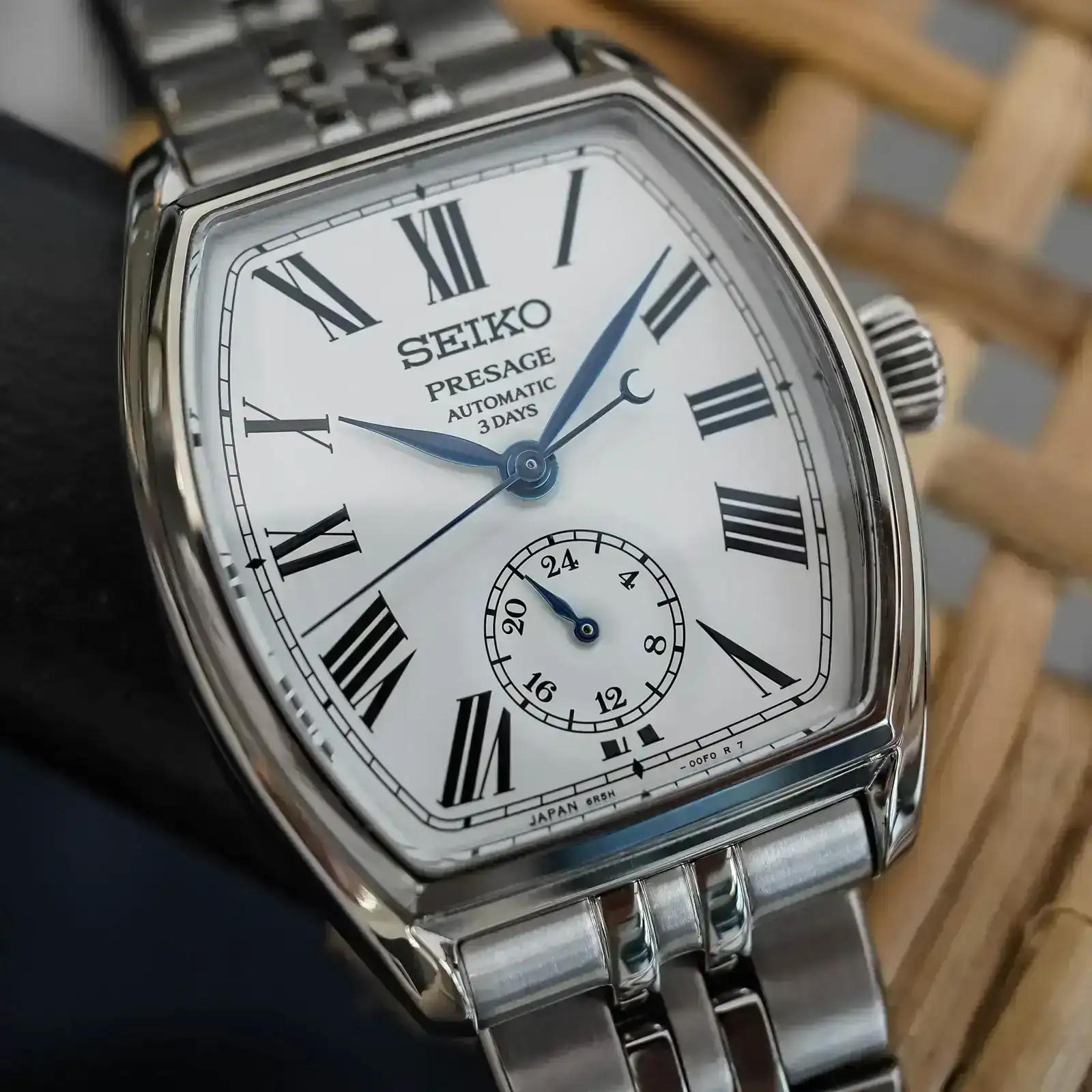 Uff!!! 😍 Me encanta ese dial de esmalte, números romanos y small seconds, sin fecha… Muy interesante!!Si obviamos su horrible cierre, el reciente Seiko Presage SPB537 de casi 36mm y 46mm de L2L tiene un gran atractivo en su caja tonel. Disponible desde 1650€.