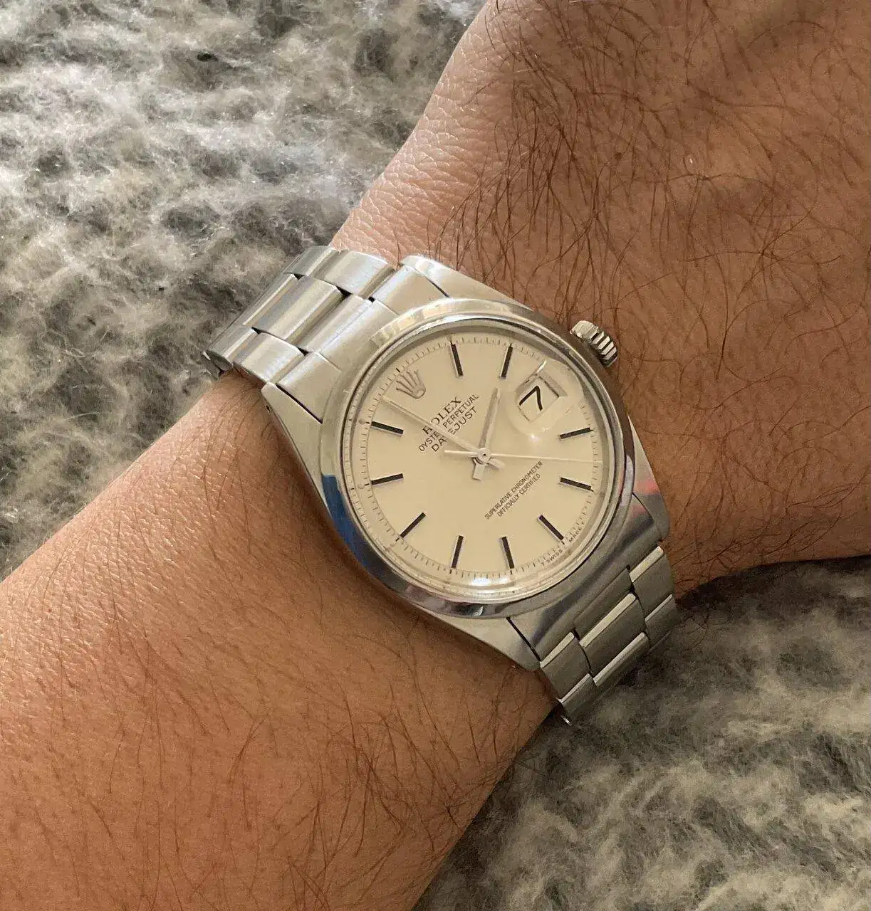 Es curioso, siempre había pensado que 36 mm no eran para mi. De hecho, no entendía como el resto de foreros podían llevar esta medida e incluso alabarla por encima de otras. Para mi y mi muñeca de 17’5 cm eran pequeños!! Pero hace unos meses conseguí una pieza muy muy antigua y de 36 mm y ahí vi la luz. No obstante pensé que si me quedaba bien ese vintage era por tener el bisel tan fino y que eso no pasaría con un Datejust ya que tenia otras proporciones. Pero nada más lejos de la realidad. Fue probármelo y …. voilà…. Me enamoré al instante…