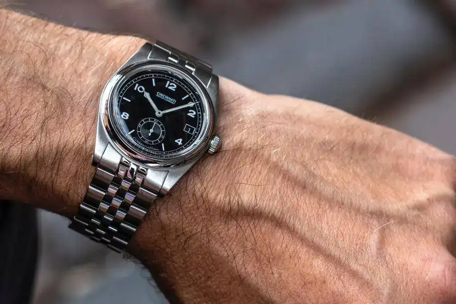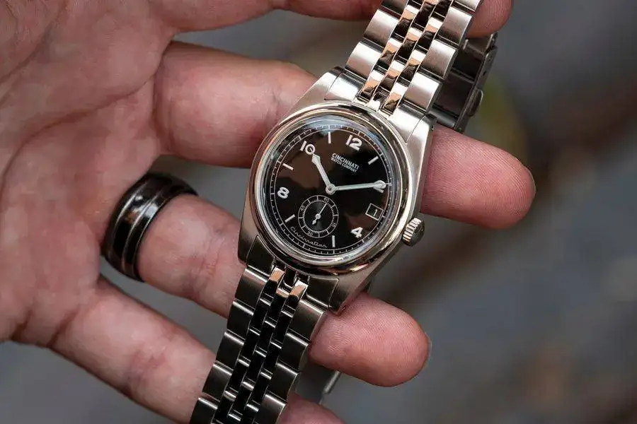 Destacaría el modelo Cincinatian. A pesar de su movimiento de cuarzo Ronda (con cinco años de autonomía hasta el cambio de pila), este small seconds resulta atractivo con sus casi 45mm de L2L, ancho de 20mm y poco más de 10mm de altura (incluyendo el plexiglás). Obviamente, es un 36mm.