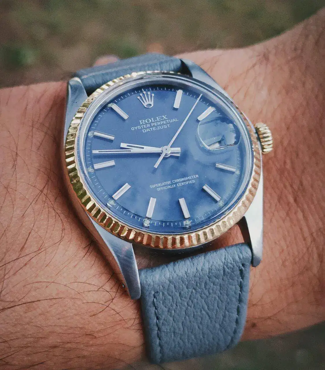 Gracias Iván! Es una correa antigua NOS, gris, que también creo que va muy bien con la esfera, muy suave, fue un "match" en cuanto se encontraron. Los jubilee de la época ni envejecen muy bien que digamos...Qué guapo.