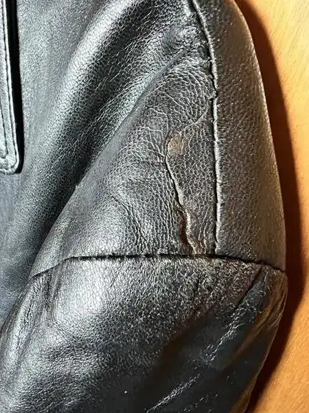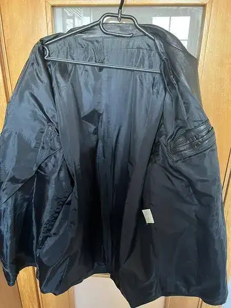 4º- Chaqueta deportiva de piel, con botones, color negro, usada con mucha vida por delante, tiene un corte en el hombro y dentro un parche, talla 54, medidas y precio 20€.