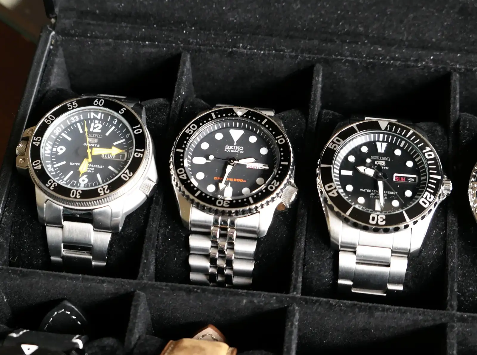 No podían faltar unos cuantos Seiko 5 Sports, un vintage (Lord Matic) y el conocido SKX 007 el cual curiosamente siendo en teoría un modelo superior al 5 Sports “Atltas” se percibe en mano bastante por debajo, fue este Atlas comprado en el mercado gris hace más de 20 años el que realmente me engancho de verdad a esta maravillosa afición