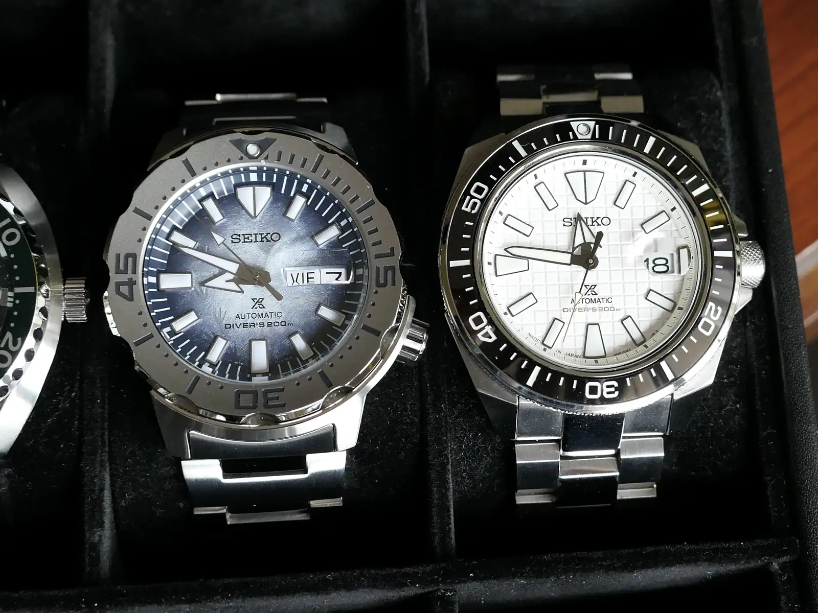 ….más modelos de la marca, como todo buen amante de la misma, no pueden faltar un Samurai y un Monster, esta última en la que para mi es la versión más atractiva de todas, la “Save the ocean” pingüinos, aparte de las preciosas y conseguidas huellas en el dial, también por verse la fecha y el día más integrados en el conjunto que en otros colores más oscuros, del King Samurai comentar que es versión “Made in Japan”, bastante escasa, adquirida por internet a una tienda de Dubái al cual le puse un brazalete Strapcode nada más aterrizar, ya que su correa de silicona tipo “acordeón” aunque cómoda, estéticamente no me gustan nada.