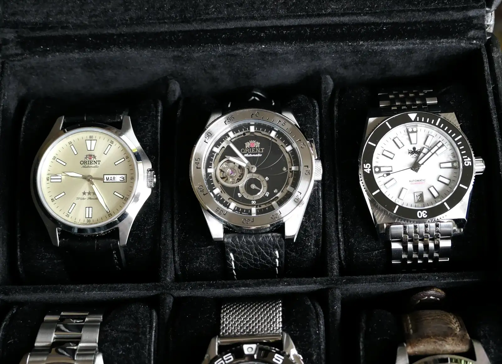 ,….como también suele ser típico de muchos coleccionistas no puede faltar la marca Orient, quien no ha tenido o tiene uno? El típico Mako, increíble calidad precio, incluso en su gama Star , también se coló un Phoibos por el medio…, una bonita edición limitada con el dial artesanal en piedra similar al mármol.