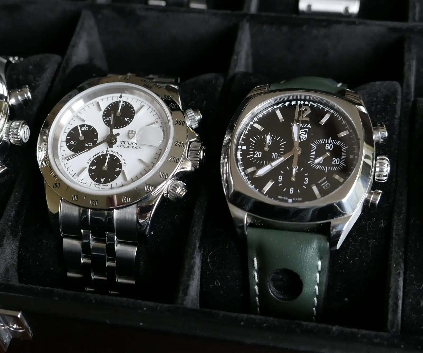 …., luego los cronos semi vintage Tag Heuer Monza y Tudor Prince crono, adquiridos de segunda mano en tiendas especializadas con sus respectivas revisiones y garantía, supongo que tendrían su pulida porque están perfectos, hay aficionados que los prefieren con sus “heridas de guerra” pero yo no, para mí son relojes que tienen mucho encanto, con un diseño clásico atemporal y un toque racing muy atractivo que como amante del mundo del motor es un gran plus, además en 38 y 40 mm respectivamente son medidas perfectas para una muñeca pequeña/mediana. El Monza es perfecto para el cambio de correas, incluso una milanesa le queda genial (me llegó con su correa original a estrenar), sin embargo el Prince se quedará con su brazalete original ya que al contrario que el Monza queda mucho hueco entre la correa y la caja.