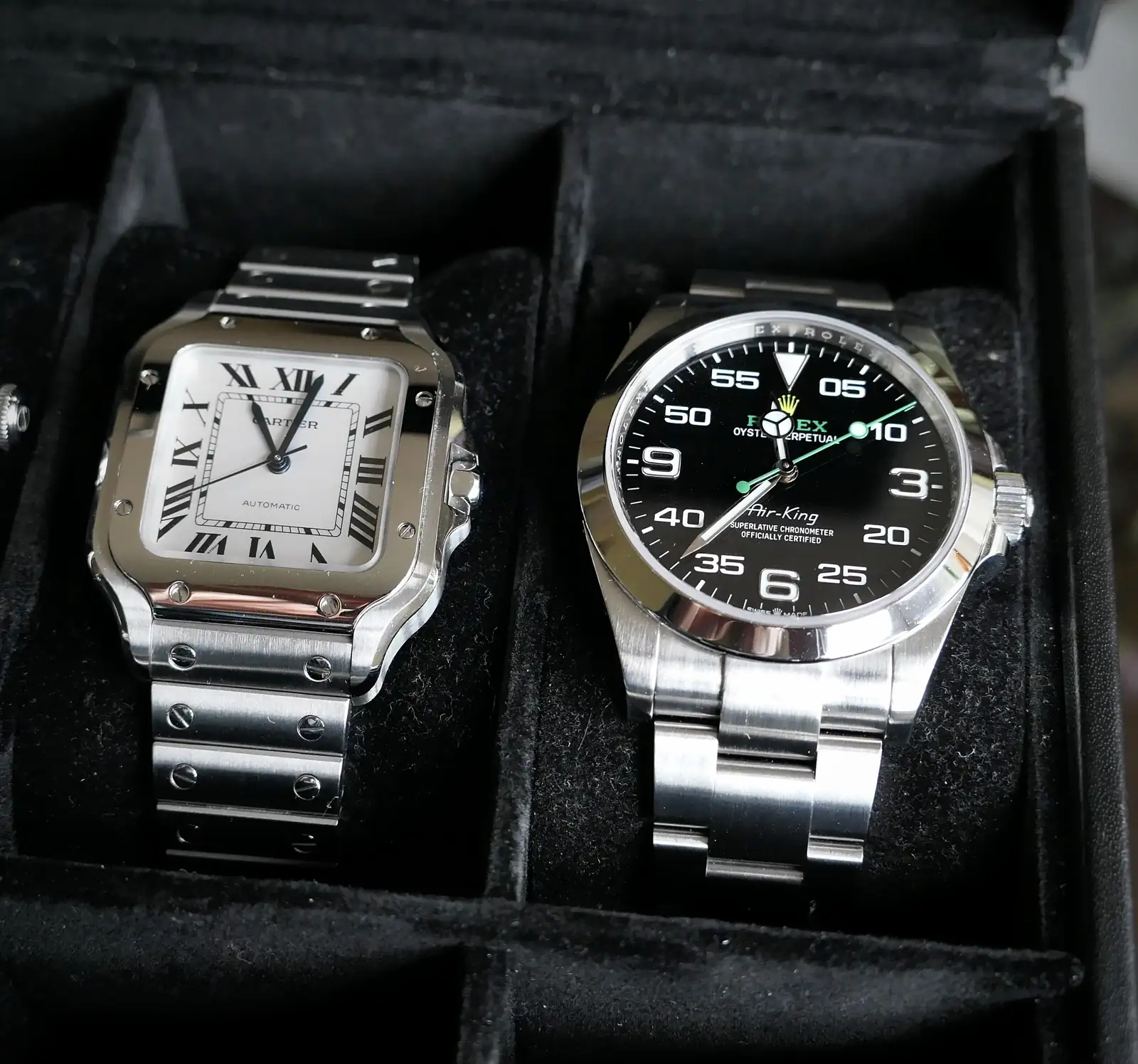 Y por último dos adquisiciones bastante recientes, el Santos al principio me costó hacerme con su caja de 35mm, estuve a punto de venderlo pero ahora me parece la medida perfecta para el tipo de reloj que es, a la mujer también le encanta, alguna vez también lo usa, además tan cómodo y liviano que no lo sientes, respecto al Rolex, esta marca, le sigo teniendo amor-odio por muchas razones..,pero este modelo de Air-King desde que salió en el 2022 no me lo quite de la cabeza, ese aire deportivo, las letras Rolex y el segundero en verde junto con la corona en amarillo tan diferente y llamativo a lo habitual en la marca terminaron por conquistarme, eso que sus sus 40mm son el límite para una muñeca que no llega a 16cm