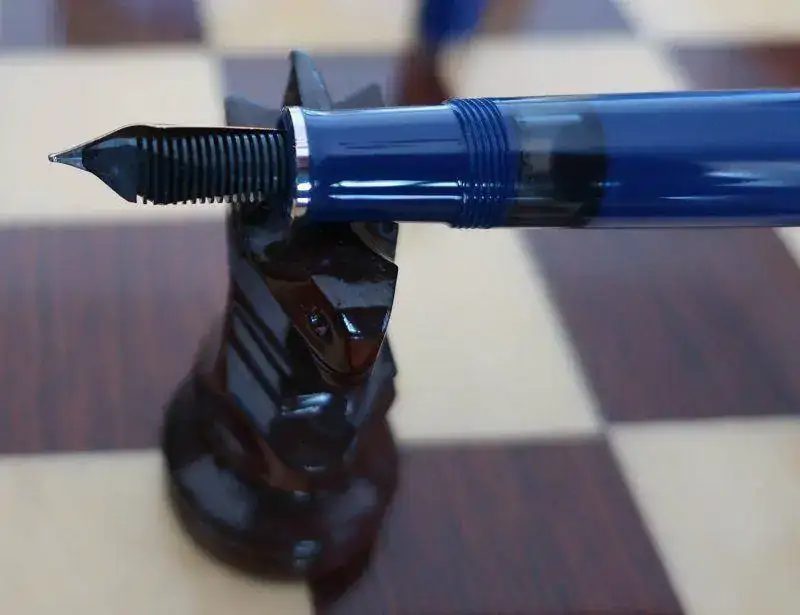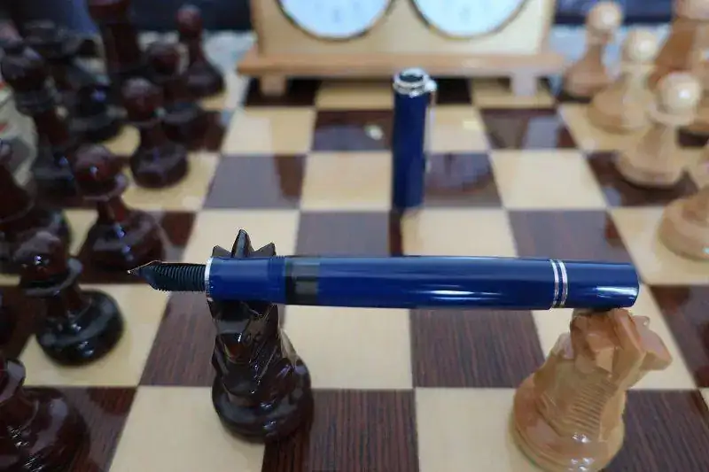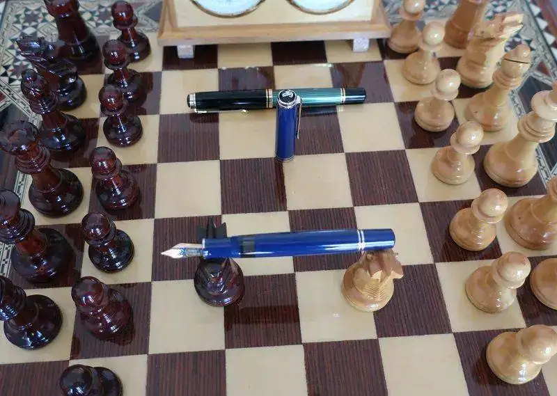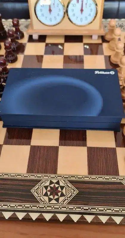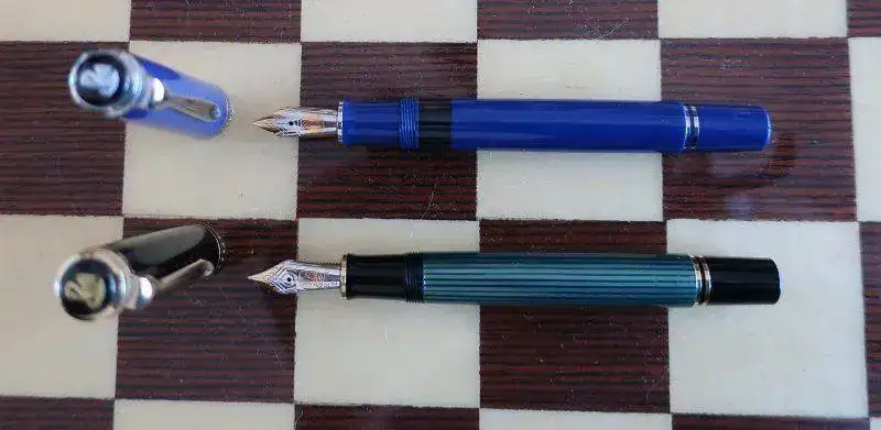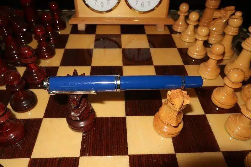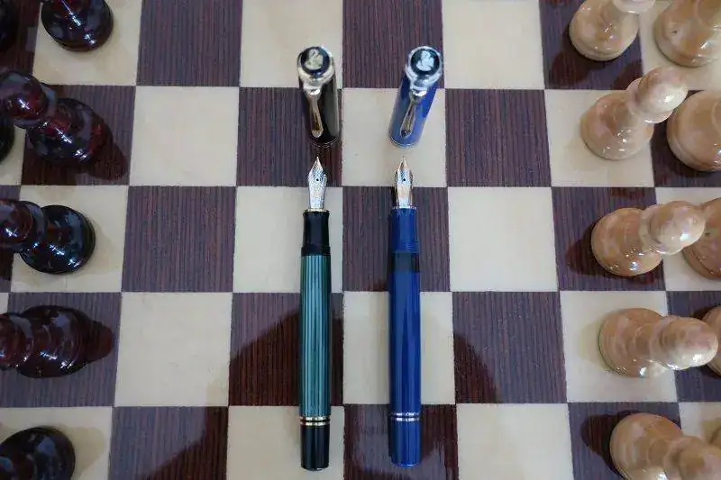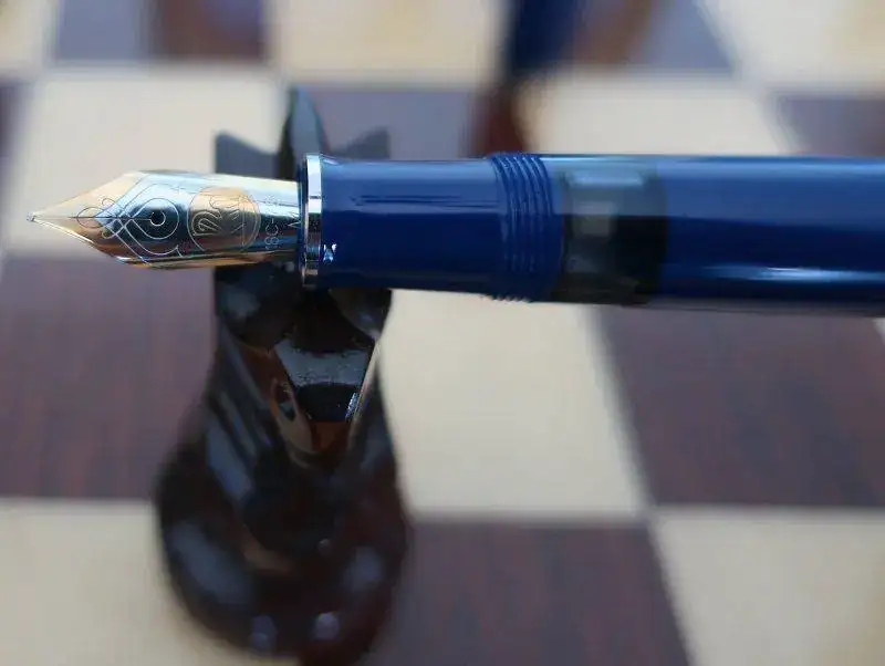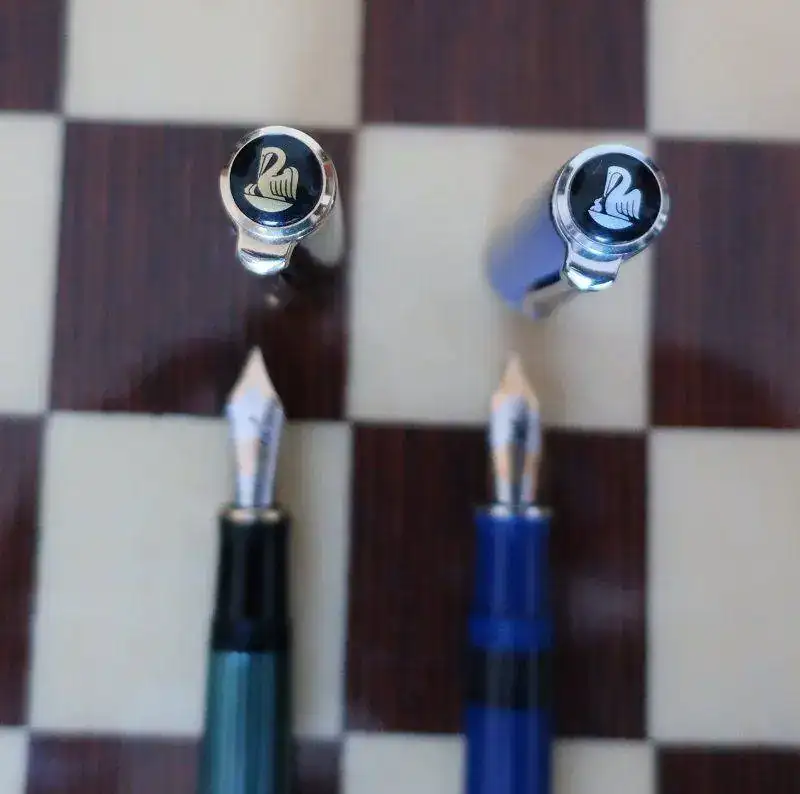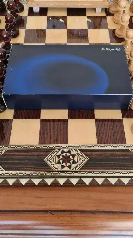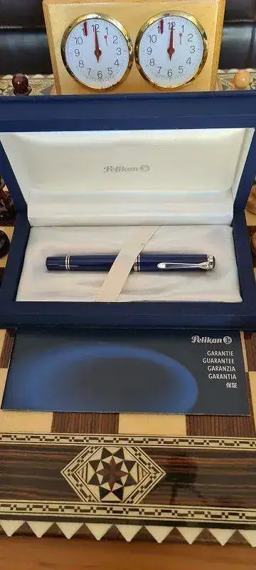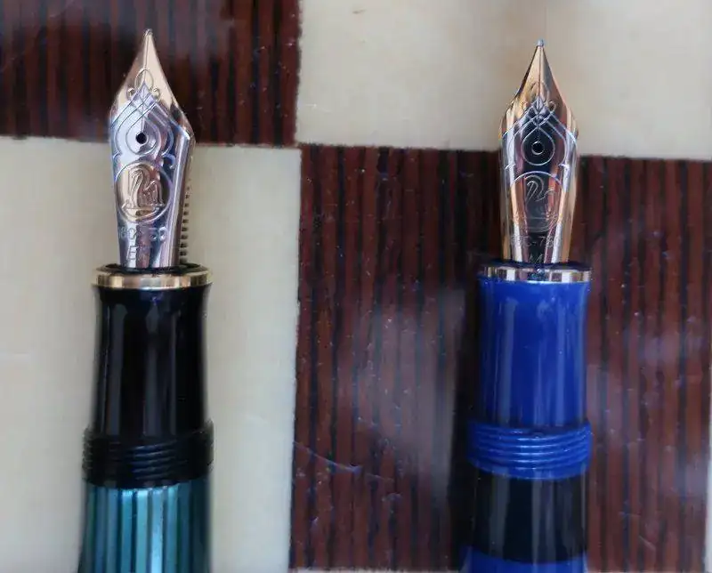Cuando Jorge abrió la caja, una gran decepción me embargó por completo. Se trataba de una Pelikan M805 Dark Blue. No es verde. La examino y no hay duda. Plumín de 18 quilates bicolor y adornos en “blanco”. Se trata de la Pelikan M805 Dark Blue que solo se editó en 2003, junto a la M405 y la M605 con el mismo apellido.