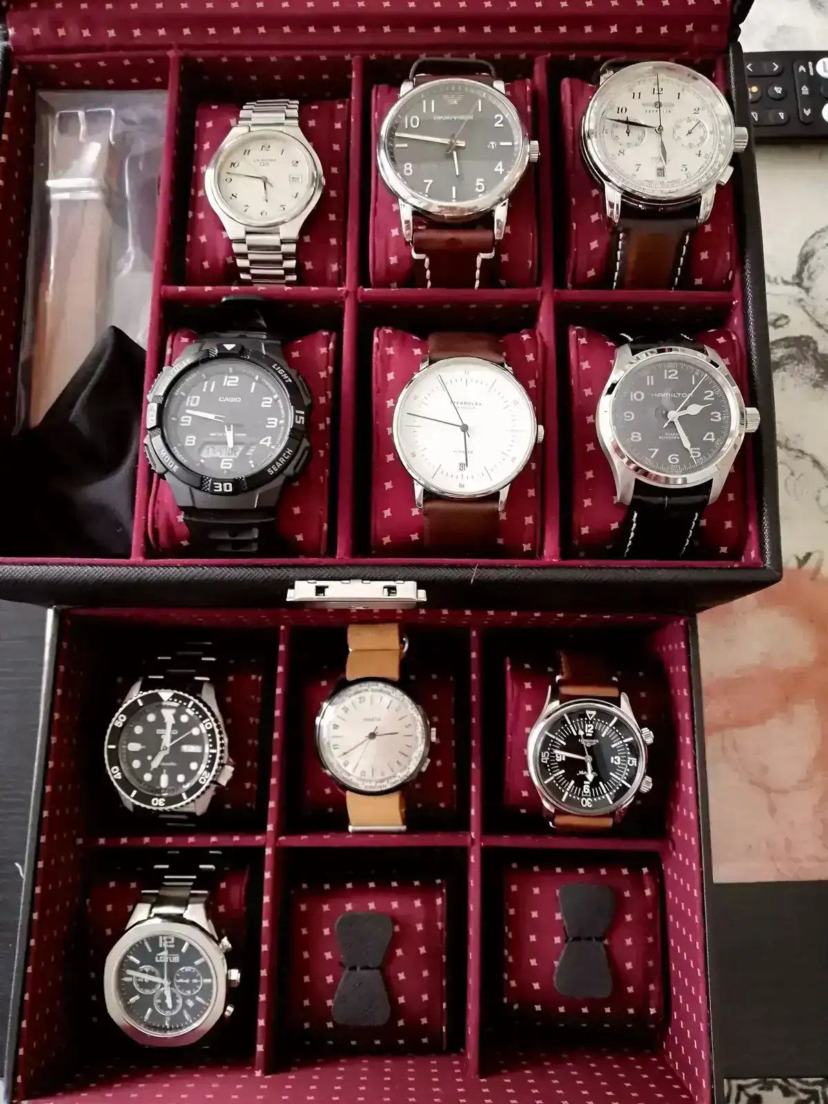 Es esa relevancia personal la que me lleva a celebrarlo mostrándoos mi caja y contaros brevemente el por qué de cada pieza. Me voy a limitar a mis relojes de pulsera, omito alguno de bolsillo que hay por ahí y alguna otra trapallada.