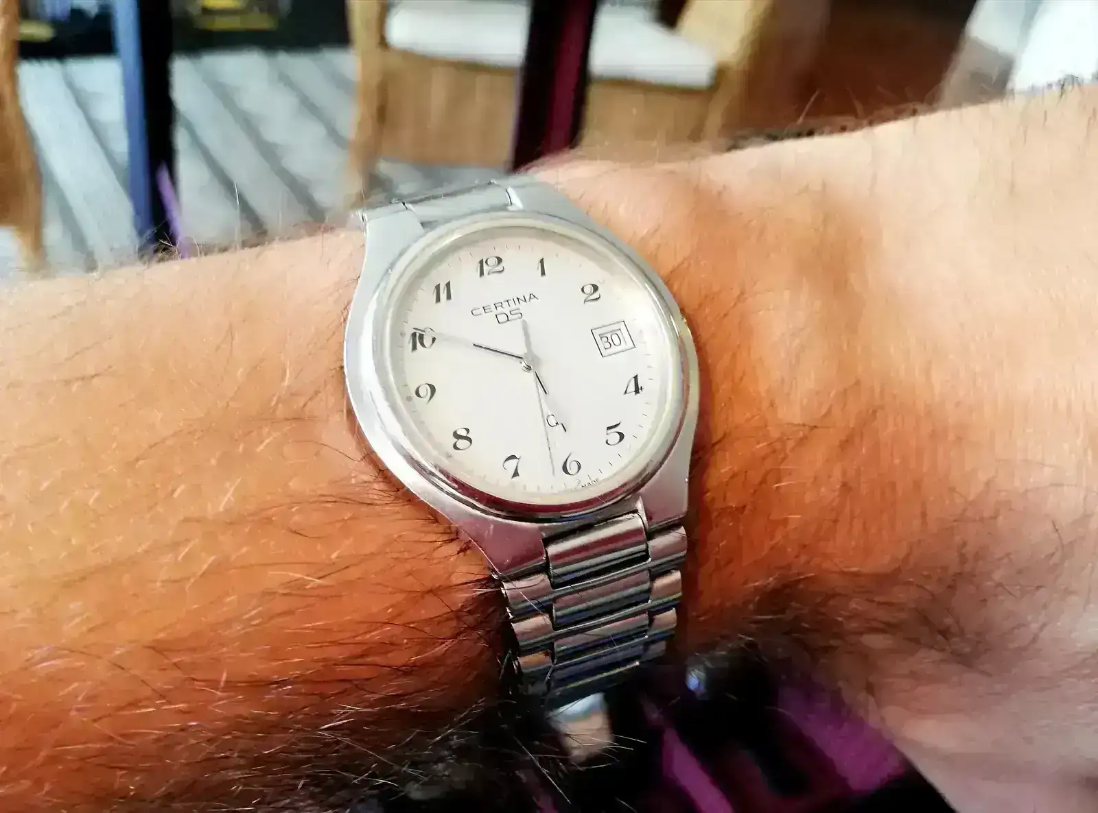 1) El primero es un Certina DS de cuarzo, un modelo de los años 90 que perteneció a mi abuelo paterno. Un reloj de caballero, pequeñito, de 34 mm, con un brazalete integrado (mira por dónde mi abuelo volvería a ir a la moda), y con una elegancia sencilla. Como era él mismo: un caballero sin estridencias.