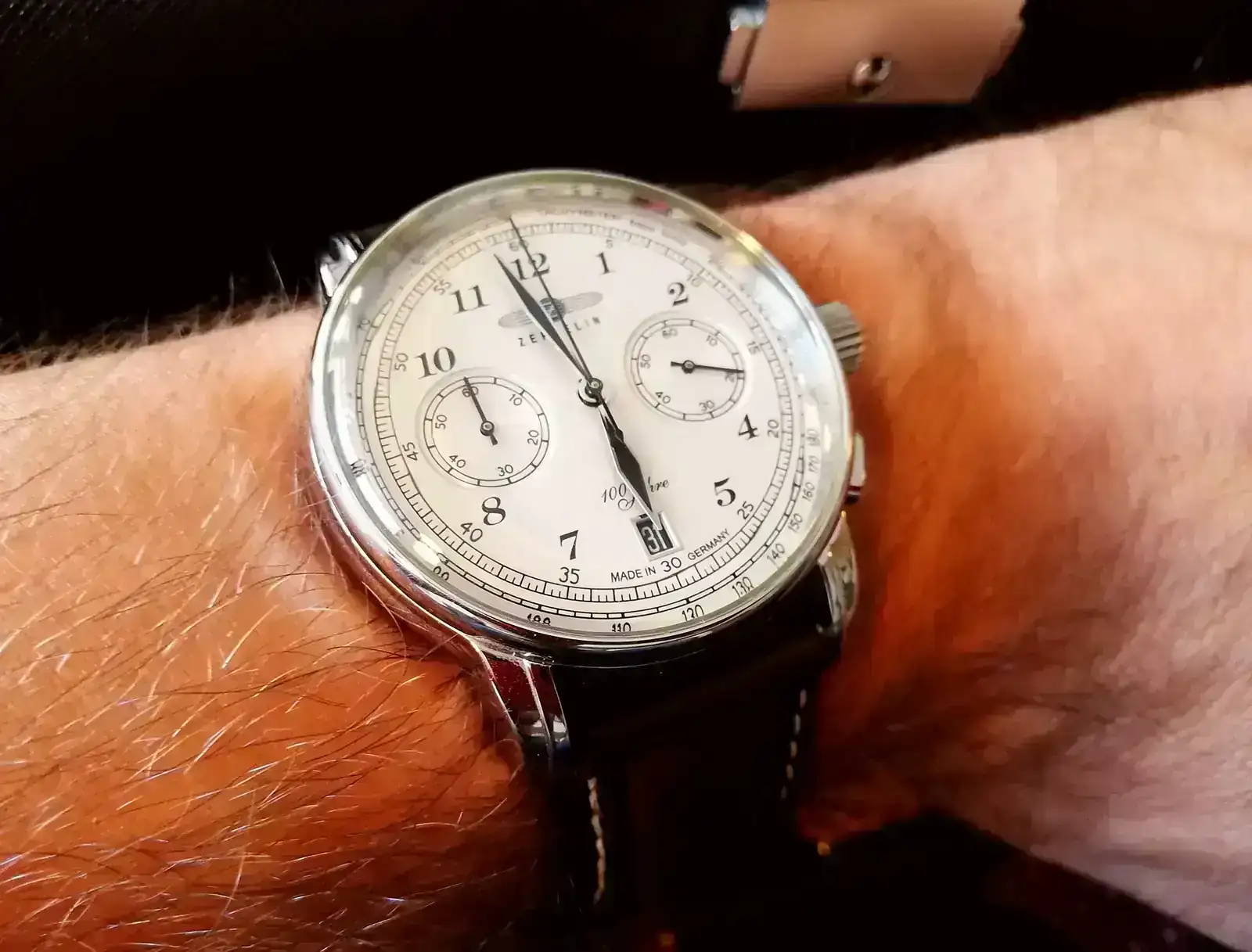 E investigando, investigando, empecé a ver una cantidad brutal de relojes que me hacían ojitos. No queriendo gastar tampoco muchísimo, me fijé en una marca que hacía piezas con un regusto vintage que me pareció cautivador. Así llegó este Zeppelin 100 Aniversario: