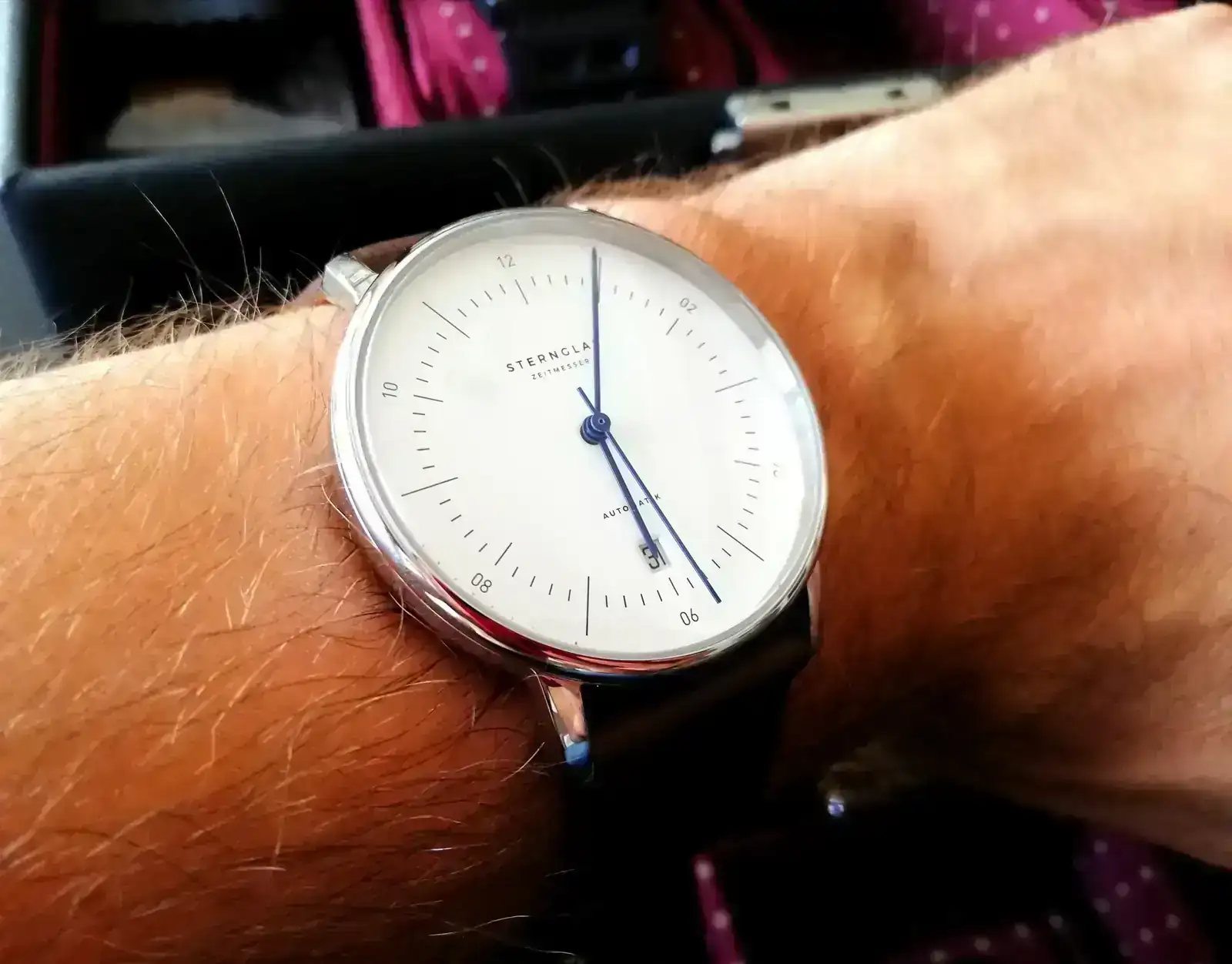 5) Llegaba ya el momento de meterse en el mundo de los automáticos. Tenía ganas de un reloj de estética Bauhaus, pero las cantidades de los Max Bill o Nomos se me hacían todavía prohibitivas (iluso de mí). Así que el escogido fue este Sternglass Naos Automatik: el preferido de mi chica: