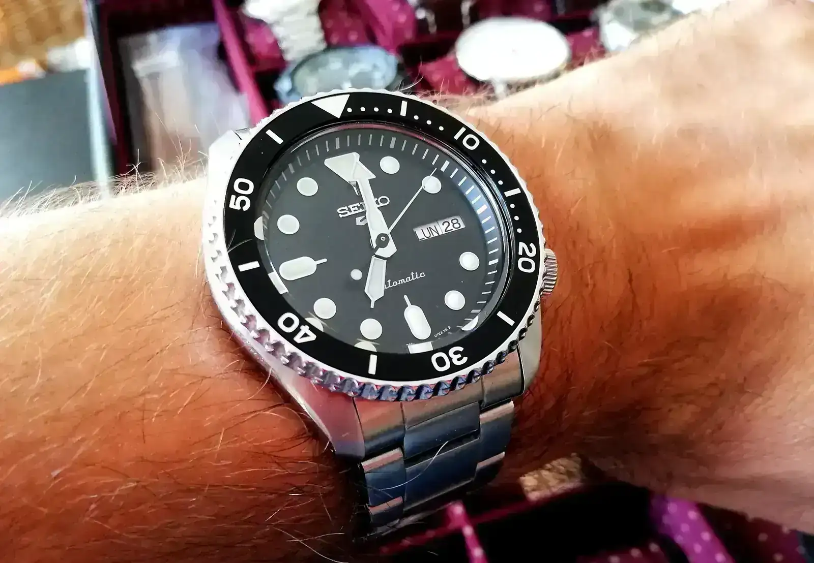 7) Se suele decir que en toda colección tiene que haber al menos un diver. Me cuesta horrores meterme en el mar, siempre me parece que está frío (vivo en Galicia). Y no buceo, que se me caen las lentillas. Así que, con estas premisas, queriendo algo económico, para no sentirme muy mal después del dispendio del Murph, el elegido fue el diver de oficina de Seiko: el Seiko 5 SRPD55K1: