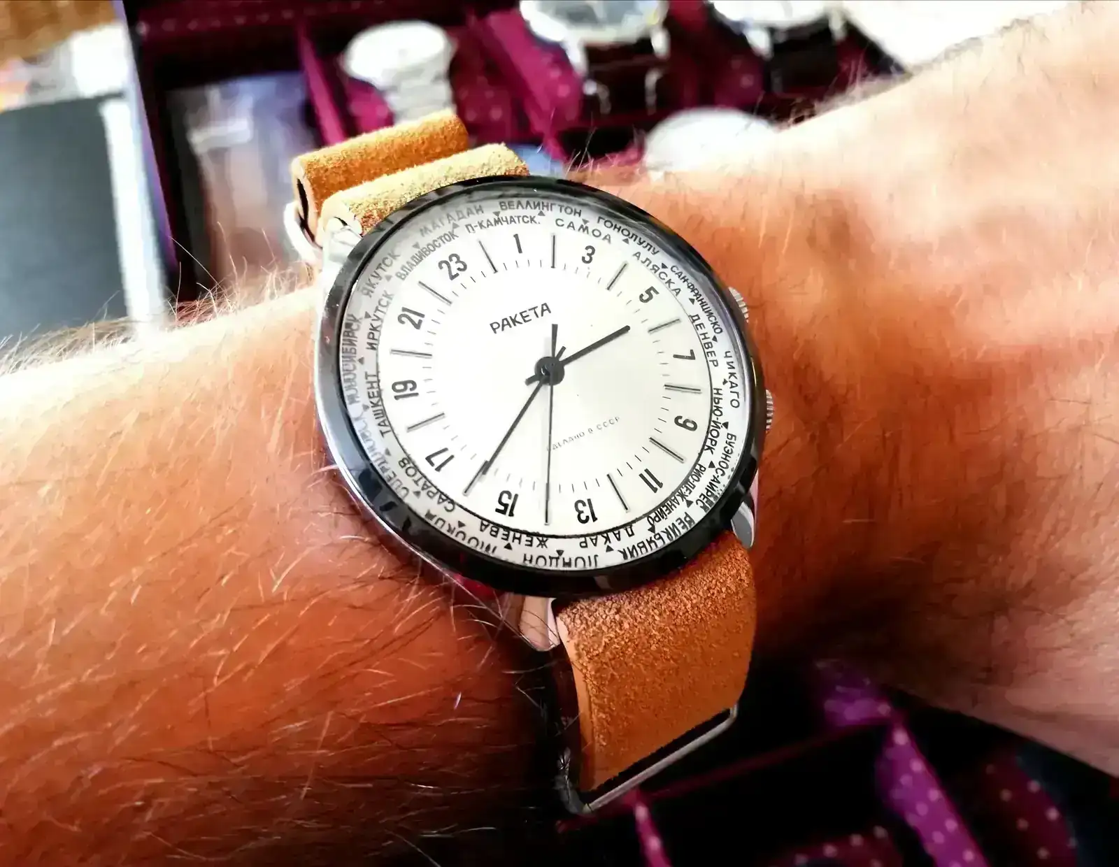 8) Uno de los motivos por los que me aficioné a la relojería fue por llevar la contraria a la tendencia de los relojes inteligentes y a la obsolescencia programada. Quería algún vintage que demostrase que estos cacharros no tienen un chip para estropearse después de dar la hora un par de años. Y además quería una pieza que se saliera un poco de lo habitual. Vamos, que me reafirmara en el frikismo relojero. Ahí entró este Raketa 24h: