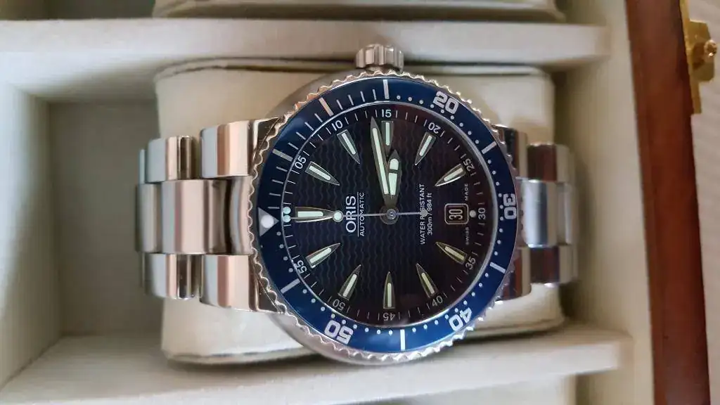 Caja troncocónica, sorprendente y distinta, una lástima que Oris la haya abandonado. Con este reloj tengo sentimientos encontrados pues según le incida la luz, tiene momentos en que no muestra toda su belleza, la esfera, las olitas, índices,.. y en otros me hace babear.