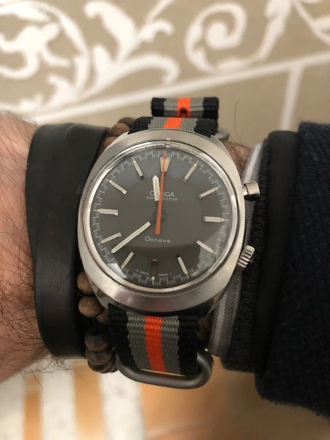 Omega Chronostop, Otro vintage, del sesenta y muchos por centrar algo más el tiempo, Omega crono de un solo minuto, lleva el calibre de época del Speedmaster pero simplificado para un minuto. Realizado para Racing, existe un modelo con el dial ladeado bastante cotizado, el único “pero” que le pongo es que es pequeñín, 34mm diría yo.