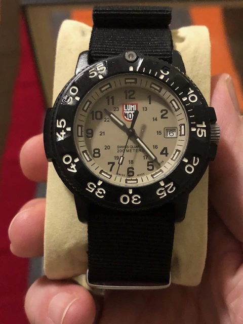 Luminox, le tocó a mi primo en un concurso de una revista hace mucho tiempo, cuando le llegó me dijo que no le gustaba … ¿Cómo? me lo das? Tuyo es. Tanque para hacer todo tipo de barbaridades y quiere más guerra, aunque ya se le notan un poco las batallas. El verano pasado le entró humedad por alguna micro fisura del cristal, taller de mi colega, sellador al canto y listo. La vida de su tritio ya se va gastando, pero todavía aguanta.