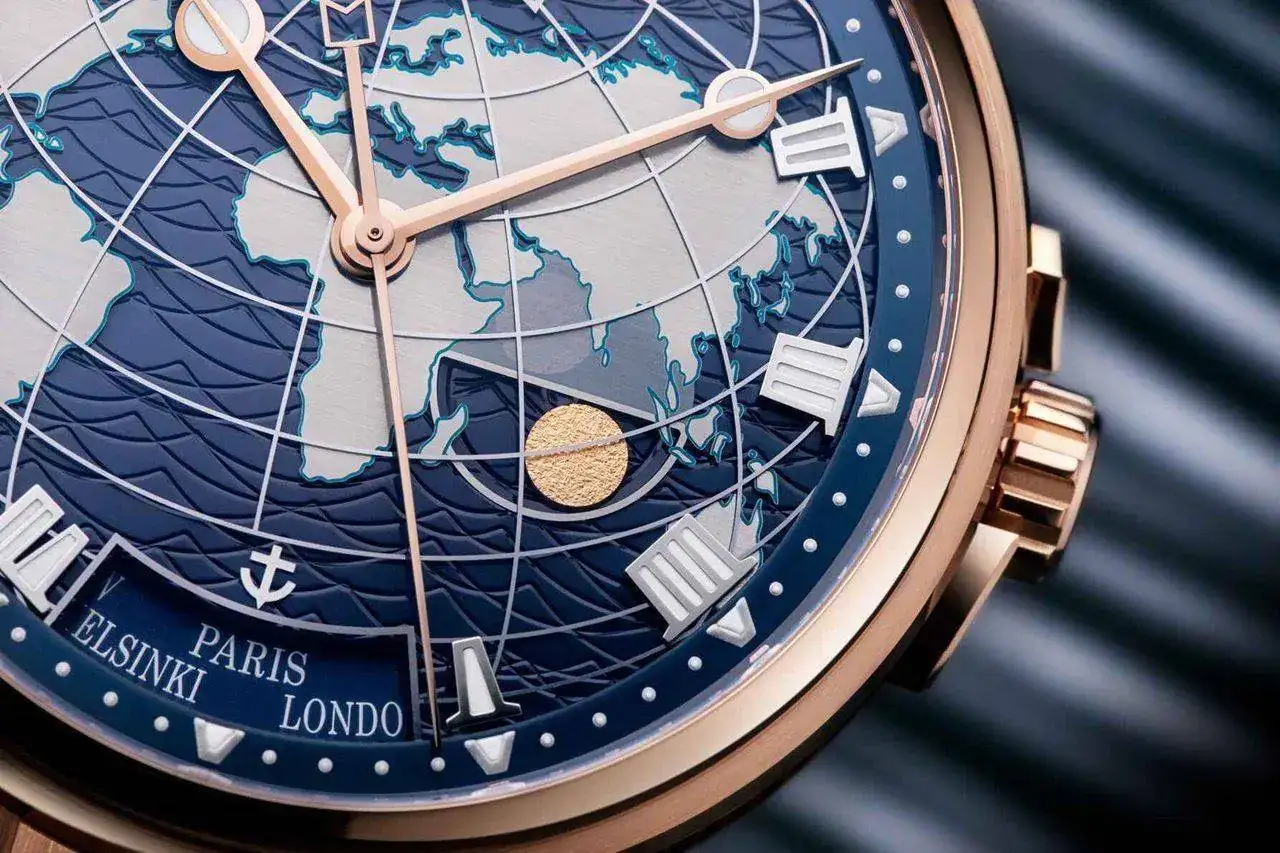 Acorde al cometido del Hora Mundi, su esfera ofrece una interpretación propia del mundo. En la primera base de oro, las olas guillochés a mano rompen contra las orillas de los continentes. El fondo soleado de la esfera, de un color azul profundo, confiere a los motivos en forma de olas una sensación de movimiento. Los meridianos metalizados descansan sobre una placa adicional de zafiro. A su vez, los continentes están revestidos con un tratamiento satinado horizontal y sus litorales delineados con un borde metálico de color turquesa. Por último, un realce exterior sirve de soporte a los distintos elementos presentes en la esfera. Todos ellos tratamientos que requieren varias semanas de trabajo.