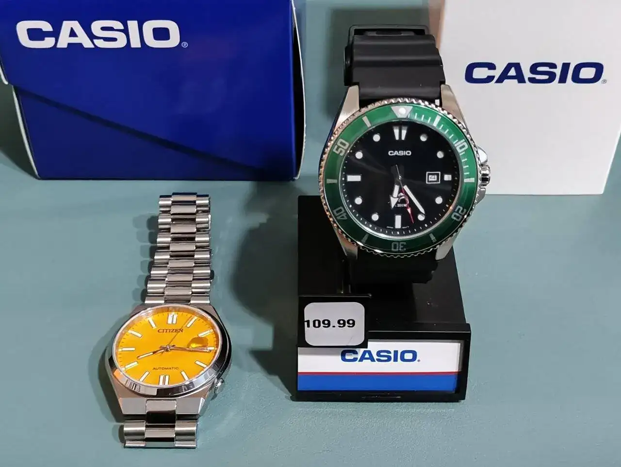 Yo, una vez desayunado un café con roscón, y recibidos los regalos, aquí está uno de ellos. El pollito es el que me voy a poner hoy, el que me trajeron los reyes es el archiconocido Casio Marlin, con su pez vela, y bisel verde. También me trajeron una correa de cuero verde oscuro, pero esa ya la enseñaré cuando se la vista al reloj que va dedicada.
