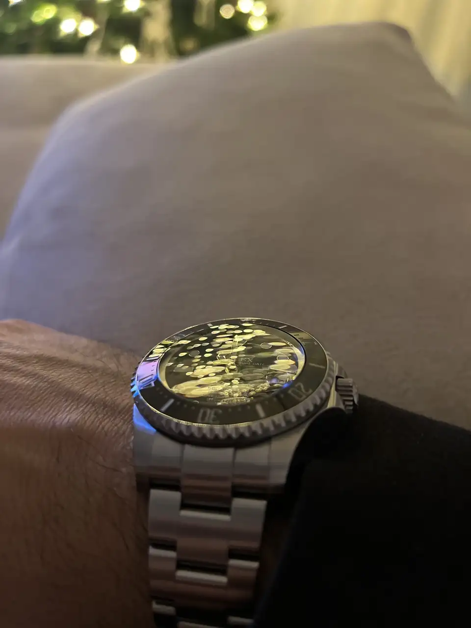 Pues aún con reflejos, es una verdadera joya.Hace dos semanas que lo tengo, es muy dificil de hacerle fotos sin brillos, le tenia muchas ganas ya que me ha costado mas de dos años encontrarlo con documentacion y caja, lo unico es que no tiene la correa original y me parece que sera dificil encontrarla, aunque de mas verdes maduran.
