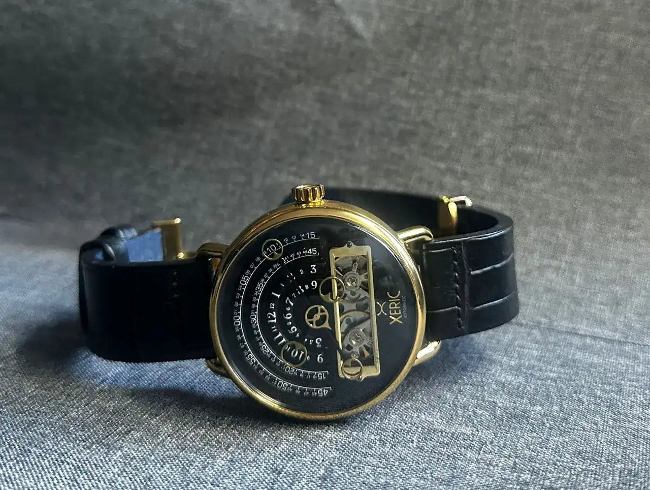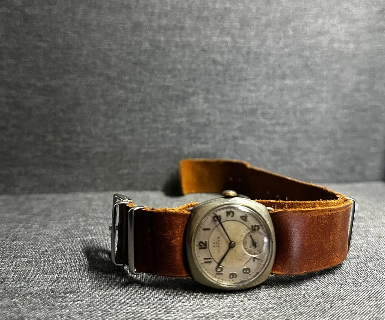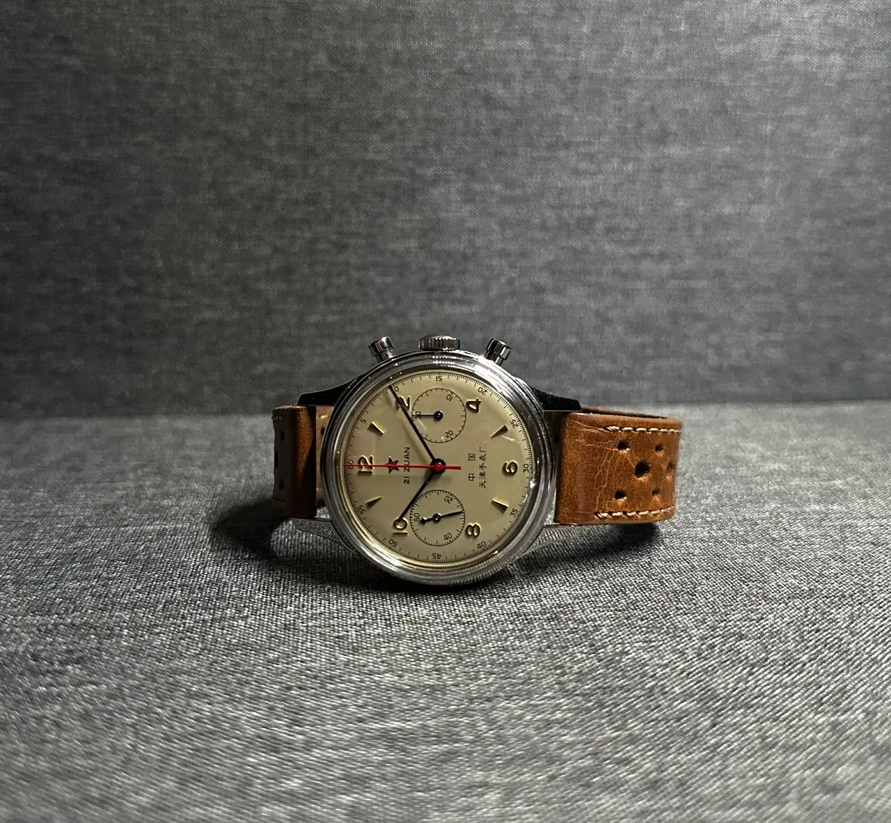 Comprado en subasta y conservado por la historia que trae el reloj. Vestido con nato hecha a mano en Marruecos tras romperse una que llevaba en un reloj chino