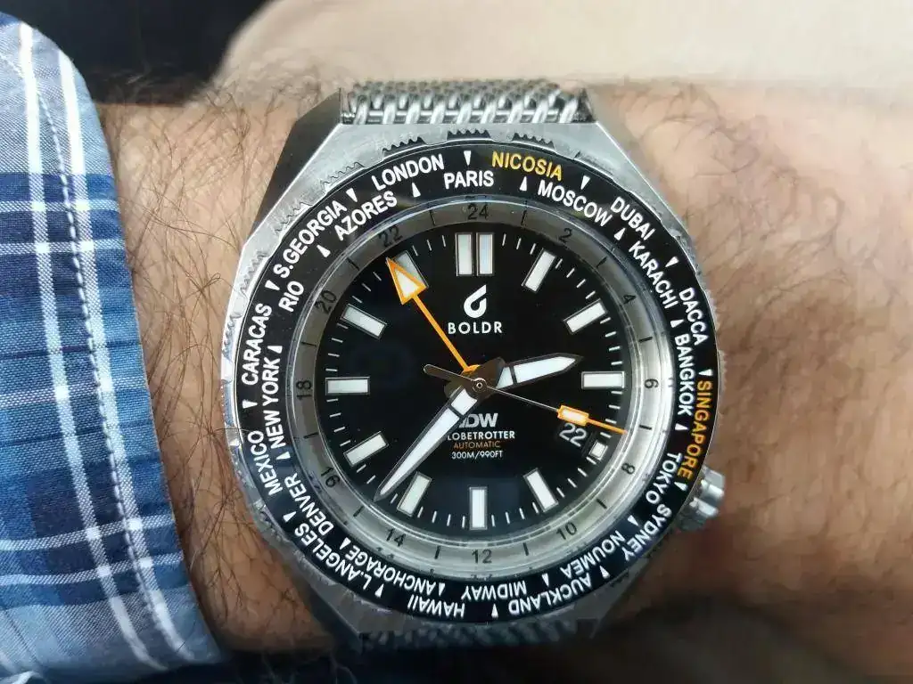 El ultimo en llegar, el BOLDR GLOBETROTTER, un reloj contundente de una micromarca que cumple bien con la calidad esperada. En este caso monta un ETA 2893-2 con complicación GMT y bisel Worldtime. Lo elegí en negro, aunque creo que cualquier versión és bonita. Me atrajo de él el que sea un fiel y resistente compañero en viajes de aventura, con ese util segundo horario. La milanesa le otorga un aspecto deportivo-vintage que me encanta además de ser ideal para climas tropicales.