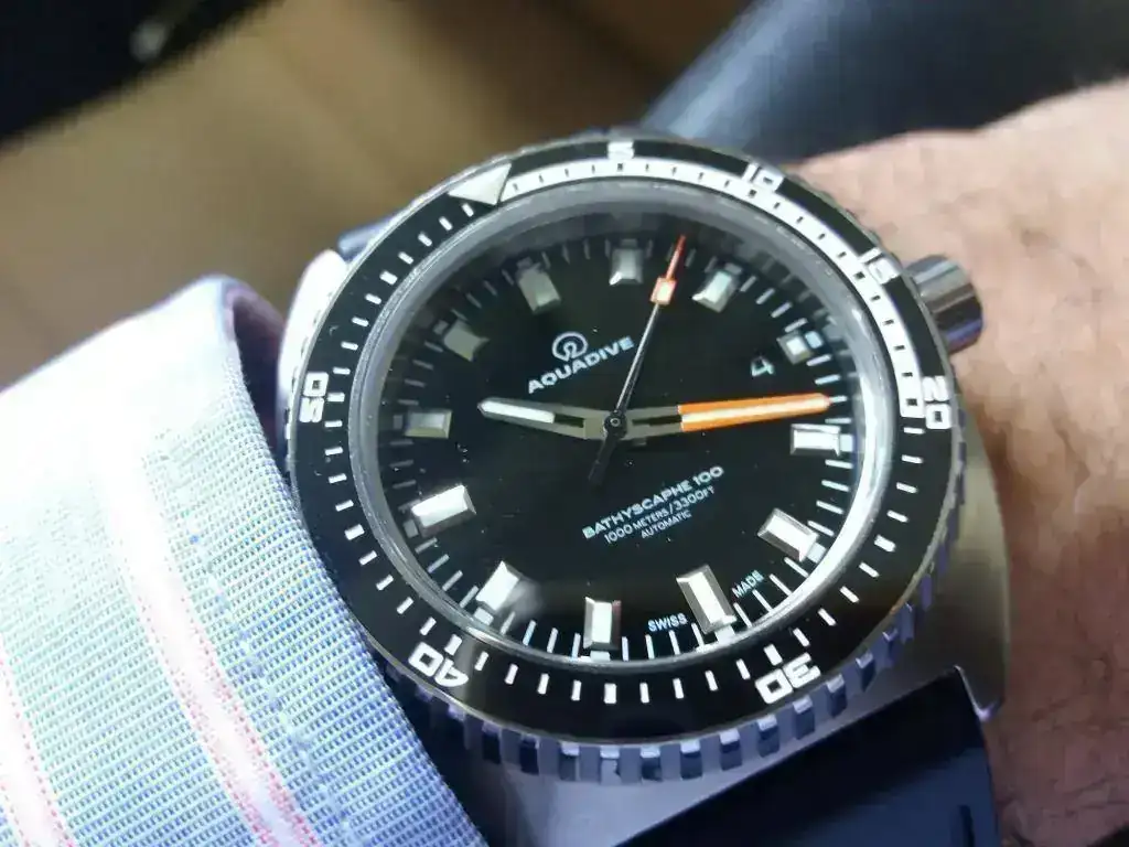Y el anterior a estos dos me llegó por la compra a un compañero del foro. Hacía tiempo que me miraba los AQUADIVE, su estetica fiel a los primeros modelos que se fabricaron en los años 7o me gustaba mucho, pero el precio me parecía excesivo para una marca practicamente desconocida que había resucitado a duras penas después de estar muchos años desaparecida con la crisis del cuarzo, y eso me echaba para atrás. Hasta que legó la oportunidad de comprar uno de segunda muñeca y en buen estado. Lo compré por foto, sin haberlo visto nunca en vivo y en directo y he de decir que la calidad me sorprendió muchisimo. Caja maciza y con un cepillado estupendo, una esfera de un negro reluciente y un bisel de cristal de cuarzo. Un ETA 2836-2 en acabado Top remata el conjunto. Sigue siendo poco conocida, como lo era en los años 70, pero apostando por la calidad tiene un hueco asegurado entre los relojes divers.