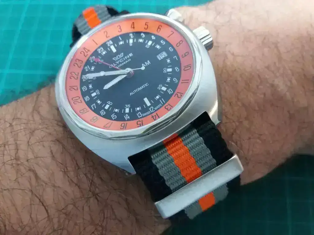 El penultimo en llegar fué un GLYCINE SST-12 PUMPKIN, un modelo que se empezó a fabricar en 1967 y hasta ahora. A pesar de algunas criticas sobre la calidad por haber sido absorbida la marca por el Grupo Invicta, y haber tenido una politica de precios muy agresiva a través de Massdrop, la verdad es que a mi me ha causado una muy buena impresión, pues se ofrece un producto de calidad swiss made con buenos calibres suizos y a un buen precio que lo hace asequible a cualquier bolsillo. El color calabaza del bisel interno es precioso y atrae miradas de todos lados. Es un reloj con una estetica muy original que lo distingue de otros muchos relojes. Por su tamaño y grosor es muy comodo y es también un buen candidato para acompañarme en mis viajes por tener tres husos horarios. Lo mismo le puedes poner una piel, como una milanesa o una nato que es la que le puesto ahora. Todo le queda bien.