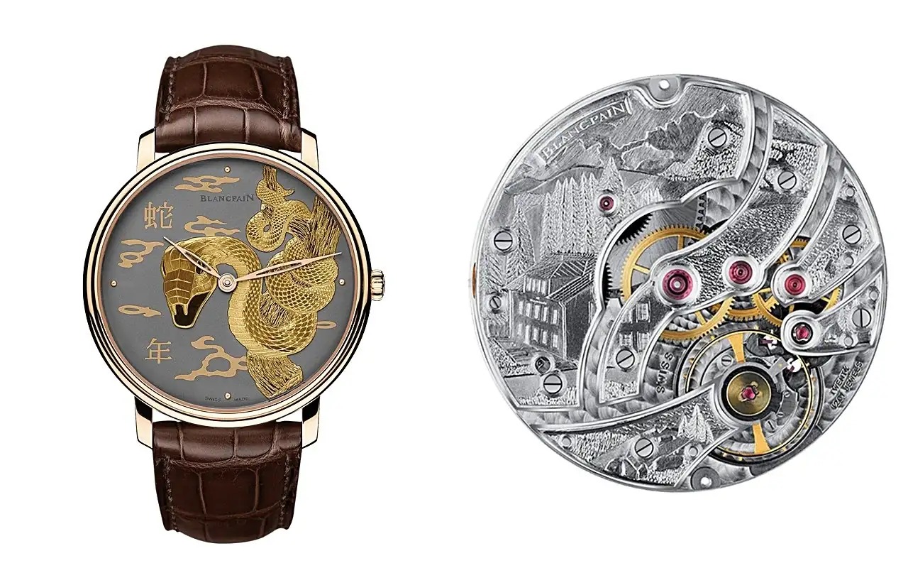 Empezando por Blancpain, que presenta una esfera damasquinada y un calibre (117 componentes, 3 Herzios, 40 horas de reserva de marcha) exquisitamente decorado a mano en una edición necesariamente limitada aunque no sé a cuántas unidades. El precio, 131.250 €