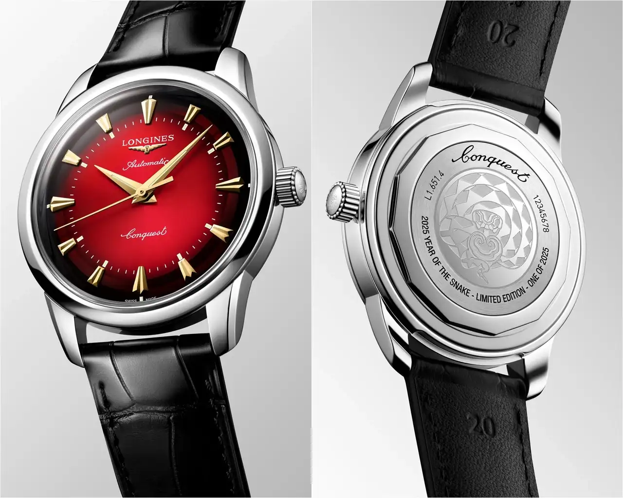 Finalmente, Longines presenta su Conquest Heritage con esfera en rojo sangre y una trasera realizada para la ocasión por el artista chino o Wu Jian'. Calibre automático L888.5 con espiral de silicio y una reserva de marcha de 72 horas. 2.025 unidades con la leyenda "« 2025 YEAR OF THE SNAKE - LIMITED EDITION - ONE OF 2025". También caja de acero -esta de 40mm- y un precio de 3.350 €