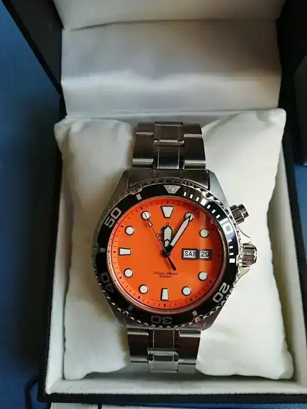 le compré hasta su brazalete original, es un gran reloj, pero el tamaño....dichoso tamaño, cuando estas rotando relojes de 43 y 44mm., ponerte un diver de 41,5, para una muñeca de casi 20cm., al final, algo no te cuadra, y eso que piensas, no pasa nada, es mi sensación, es un relojito bien mono, para el verano, y además iba perfecto, nada que envidiar a los automáticos suizos, este estaba en una precisión de +3 seg/día.