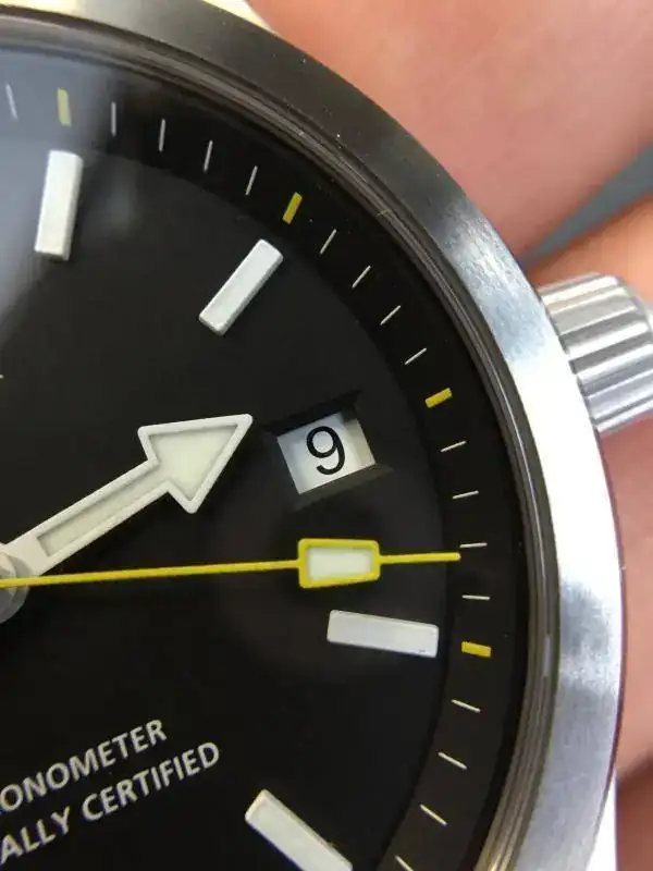 La esfera ofrece una legibilidad casi perfecta, merced a una esfera negra mate que contrasta muy bien con los índices blancos y los detalles en amarillo, que a mi, que no me gusta nada ese color, no me cansan en absoluto.