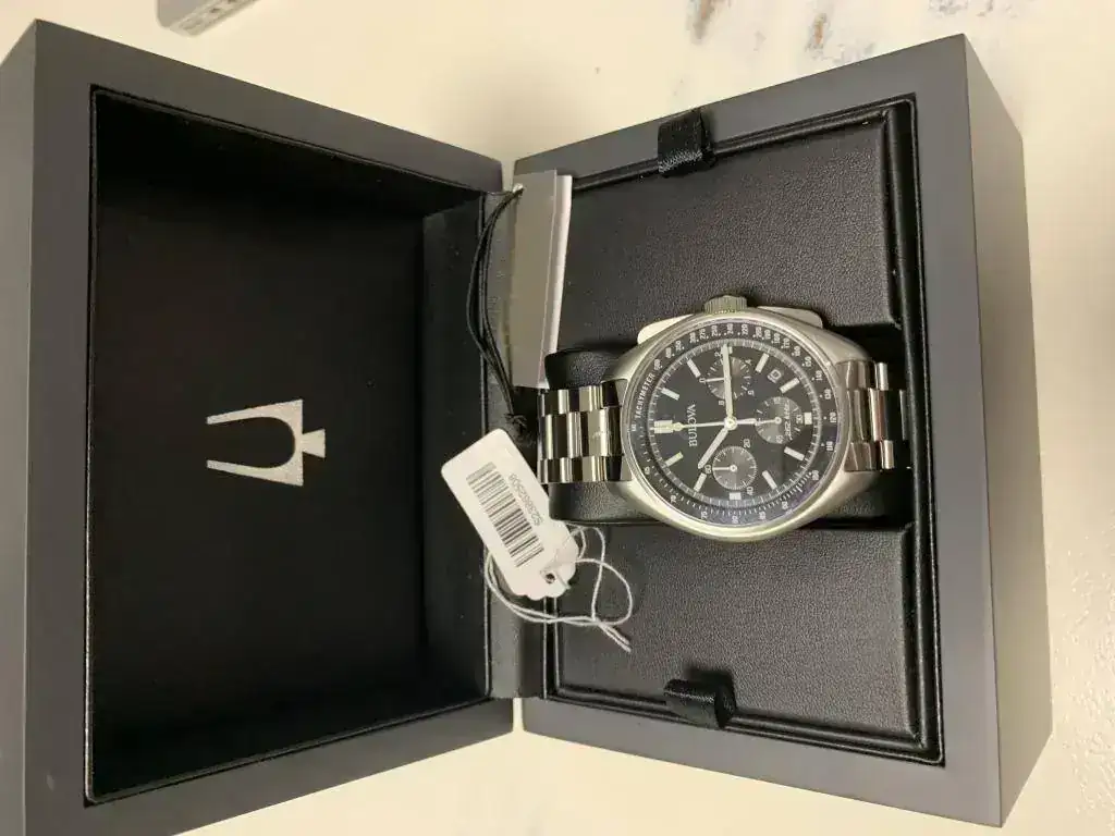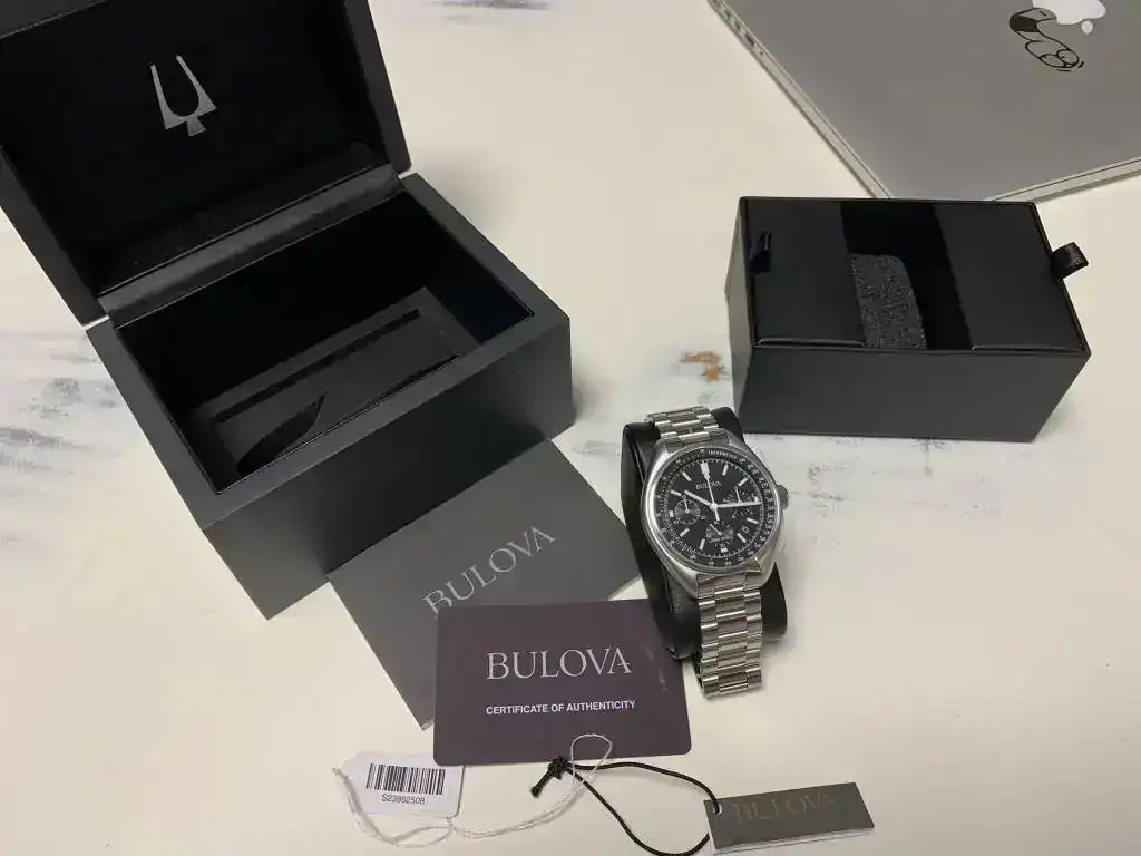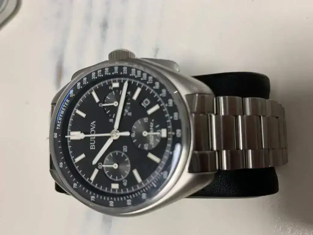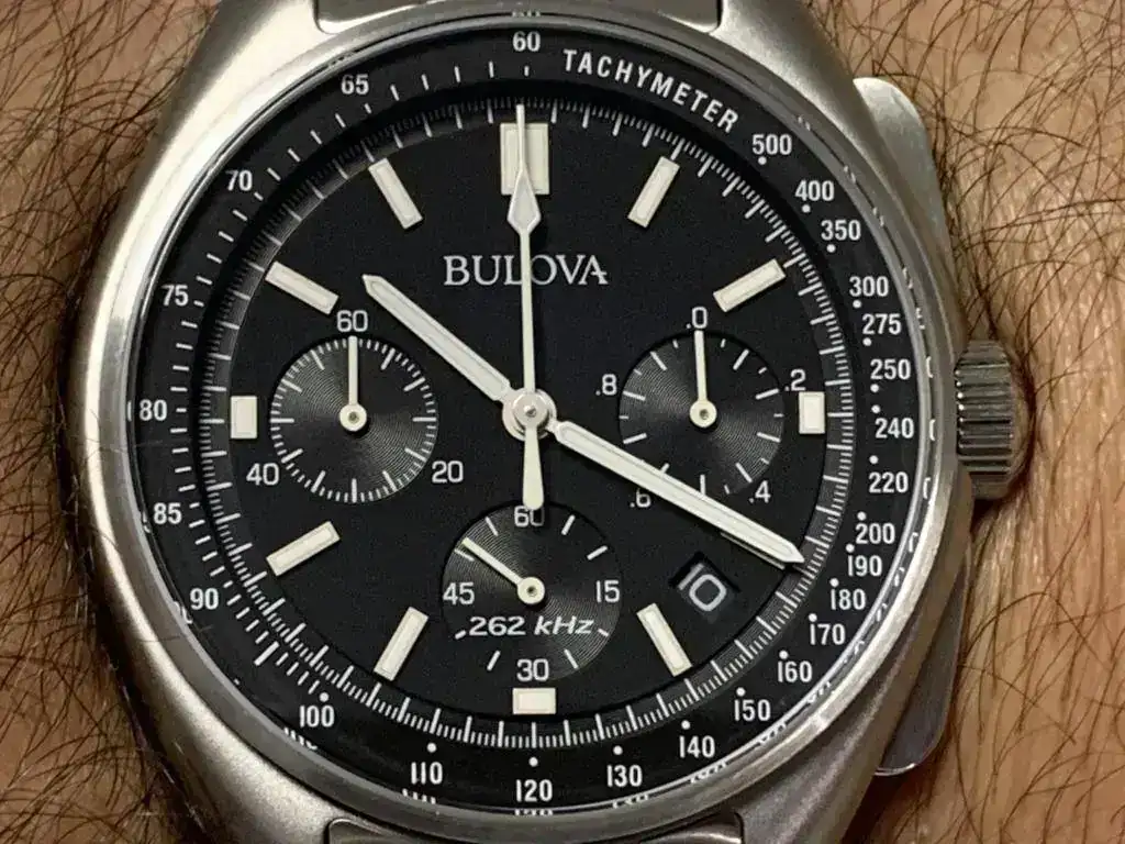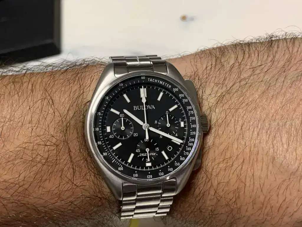 Aquí os dejo las fotos de mi BULOVA LUNAR 96B258, eso sí, con armis metálico, pues si algo he aprendido con este vicio nuestro es que resulta más barato comprar el reloj con armis metalico de entrada y después ponerle lo que uno quiera (nato, piel, etc...) que hacerlo al revés, pues los armis originales suelen ser muy caros.