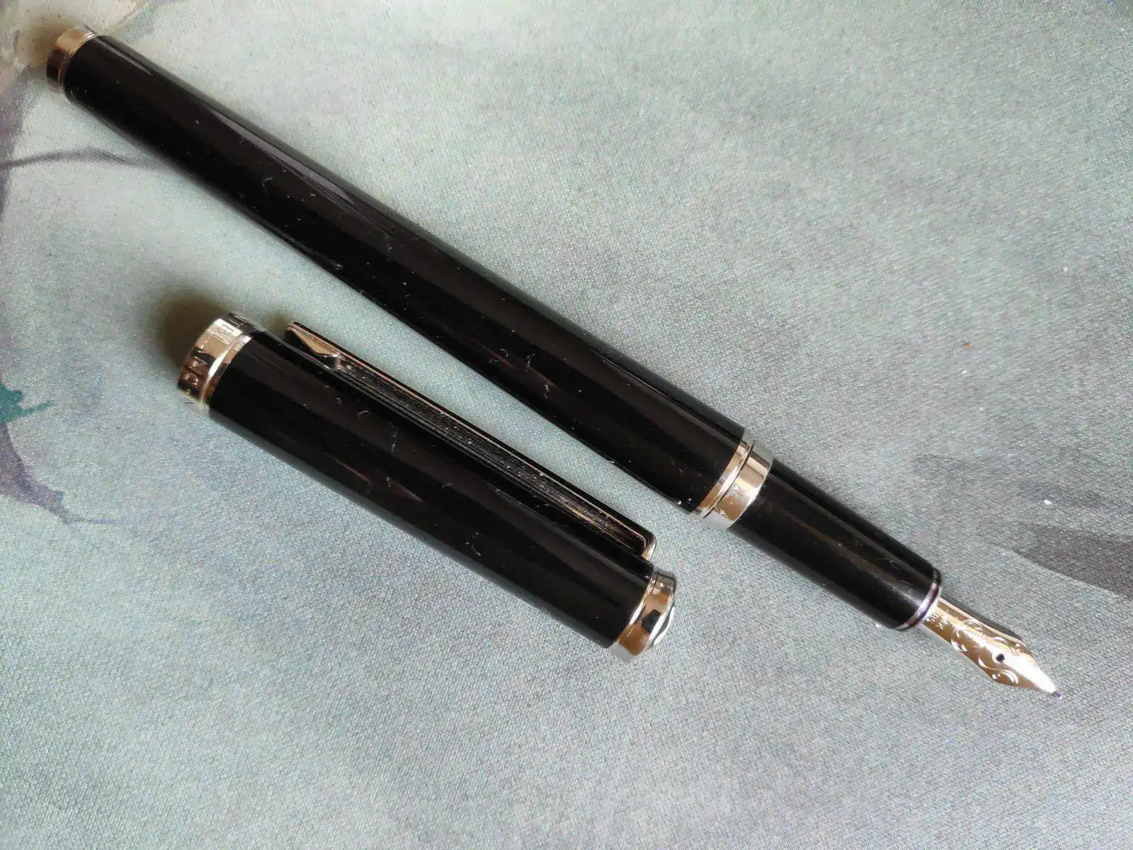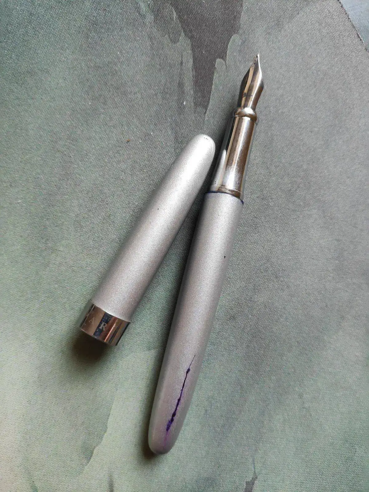 La siguiente es una Stypen de batalla, regalo de mi hermano. Una pluma sencilla y sobria que me gusta mucho estéticamente. La usé a diario en el trabajo, hasta que comenzó a mancharme los dedos y el cuerpo terminó por rajarse. Se ve que no aguantó tanta batalla.