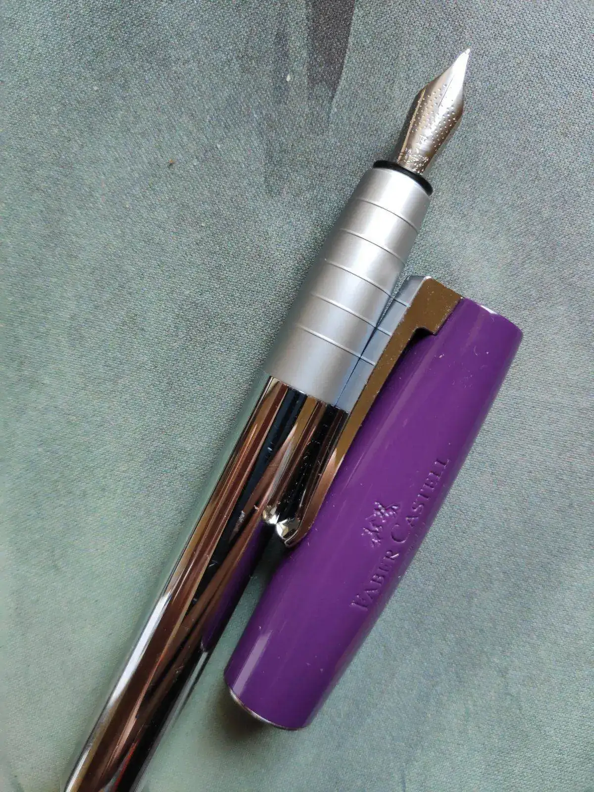 La siguiente, una Faber Castell procedente de la liquidación de una papelería. Punto F de tacto algo desagradable. A los pocos días de usarla, comenzó a supurar tinta, el cartucho universal que le puse le quedaba flojo, conque al final la tengo relegada. Me sospecho que algún problema debe de tener, el plumín no está del todo bien alineado al examinarlo de cerca. ¿Me la habrá colado la dependienta? Una pena