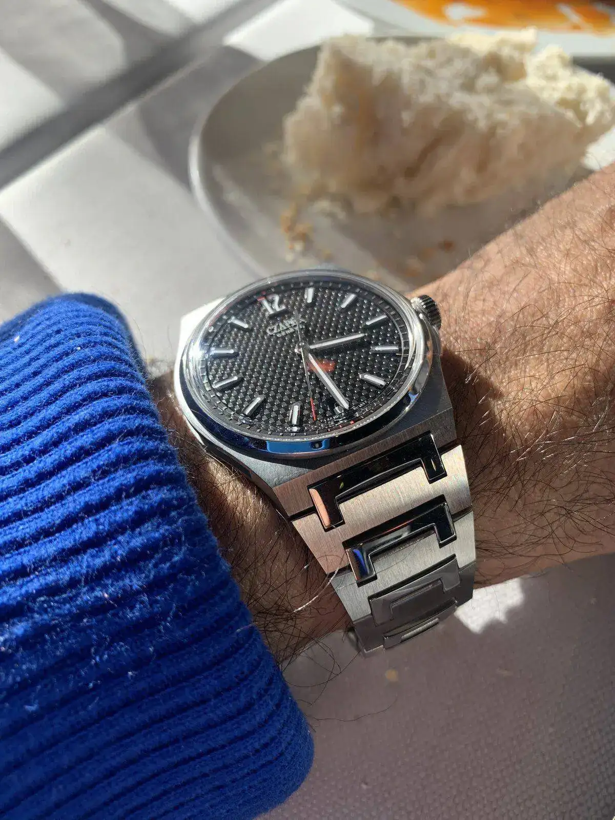 Y el Alpinist me ha encantado, es el modelo negro, una actualización del Red Alpinist negro de los 90. Me gusta cada milímetro de este reloj, pero en especial las agujas me parecen preciosas, la caja robusta y compacta con sus lineas fluidas y el tamaño perfecto, y en general esto que tiene el Alpinist sea en el color que sea, que es un reloj herramienta pero de un clasicismo y una elegancia tremendos. Con ropa normal se ve muy bonito y ya me lo he llevado también al campo el mismo día del estreno, en su ambiente es perfecto.