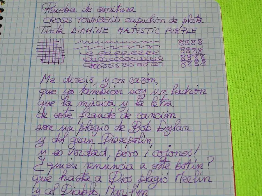 La que presento es una pluma Cross Townsend con el capuchón de plata. El plumín es muy duro y la escritura en estos casos está un poco falta de la personalidad que le proporciona un plumín mas flexible. Aún así no hay duda de que escribe muy bien. Aquí dejo una muestra de escritura: