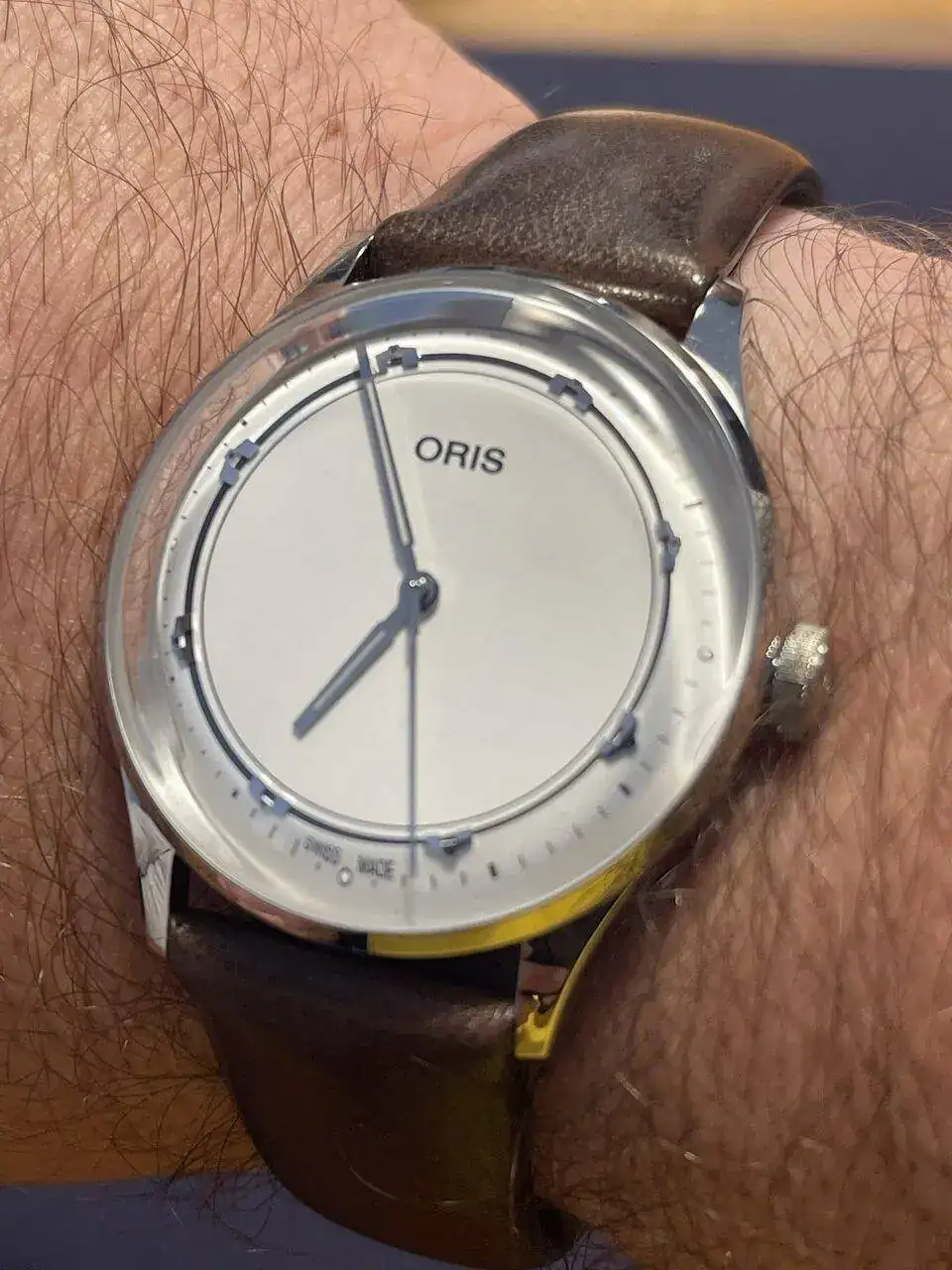 No me resisto a desvelar una anécdota que surgió en la entrevista que le hice a Herr Herzog, que quedó off the record y que me decido a revelar porque no hace más que hablar bien de él y de la marca: comentando la calidad general de los relojes, tanto intrínseca como percibida, le dije que me parecía una auténtica pena que algo tan básico en la percepción como las correas fueran tan "sencillitas" o en cualquier caso no parecieran estar a la altura. Me alegraría pensar que ese comentario no cayó en saco roto y que es parte del motivo de que Cervo Volante firme las nuevas -y hermosas- correas de Oris. Herzog me dijo que lo iba a tener en cuenta.