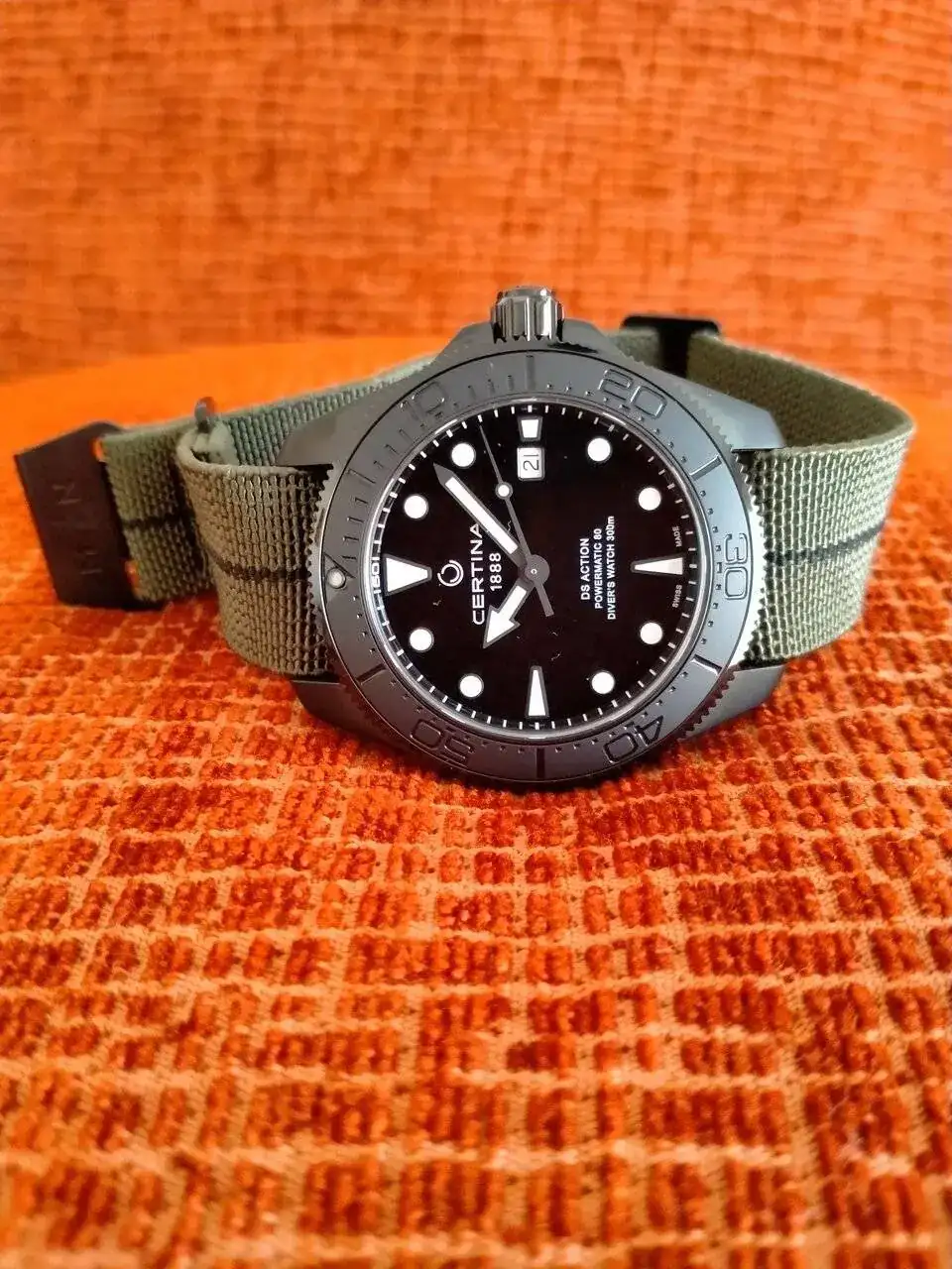 He de reconocer que el GMT me gustaba (y me sigue gustando), pero también es verdad que hubo una temporada en la que me quise desprender de él. Cuando asumí que era mejor continuar con él que malvenderlo, decidí "adaptarlo" algo más a mí gusto personal incorporándole una Erika Strap que le daba un aire perfecto, a parte de que es lo más cómodo que existe para llevar un reloj. De hecho es una correa que sigo conservando y que, como se ve en la foto, la llevo en el black Diver. En cuanto al GMT, si vuelve a ver una alineación astral, es posible que pille el mismo Certina, pero con otra estética como puede ser el de dial azul con nato o el dial negro con ármis ... pero eso ya es otra historia ...