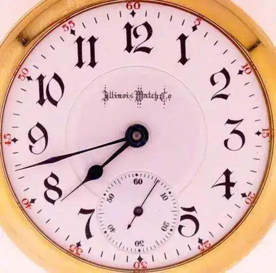 Si nos vamos a la “biblia” de los relojes Illinois, que aún no he podido consultar, Meggers & Ehrhardt's Illinois Watch Co. Encyclopedia and Price Guide, American Pocket Watches Volume 2, Heart of America Press, 1985) pero que el Sr. Edward L. Parson resume e ilustra para el Internet Horology Club 185 vemos que el dial se trata de la primera variante “Bold Gothic arabic numeral dial with Serif top-four” y "double Sunk dial"