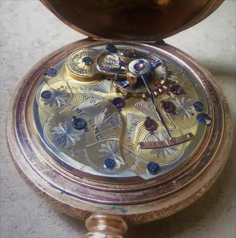 En esta otra imagen podemos apreciar su precioso damasquinado realizado en oro, su regulador micrométrico (una variante del Reed patent de 1867) y sus chatones realizados en oro rojo. Los tornillos del regulador son de oro amarillo. Y el reloj está ajustado a temperatura, isocronismo y a 5 posiciones, lo que nos da una perspectiva de la calidad de los relojes genuinamente norteamericanos que fabricó el Sr. Gruen.