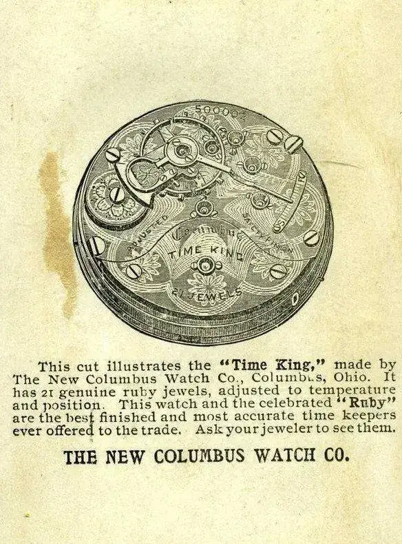 Así la fábrica se reorganizo nuevamente en la conocida “New watch Columbus Co.” y en 1894 sacó a la venta el “Time king” vamos a verlo (esta es la única imagen publicitaria que he podido encontrar del mismo de 1895)