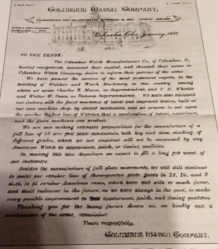 Efectivamente, en 1882 la “Columbus watch Co” se instaló en una nueva fábrica ya de un tamaño considerable y empezó a manufacturar sus propios calibres, convirtiéndose en pleno derecho en una marca genuinamente americana (Aunque no por ello dejó de importar calibres suizos pero ya en menor medida)