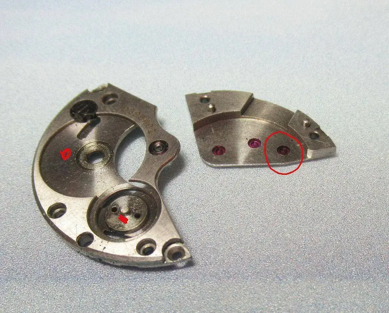 Y en su día alguien cambió un rubí rojo por uno transparente, como también señalo. Se aprecia en las partes internas los restos de aceites resecos que es la causa de tu torpe funcionar. En las zonas que señalo