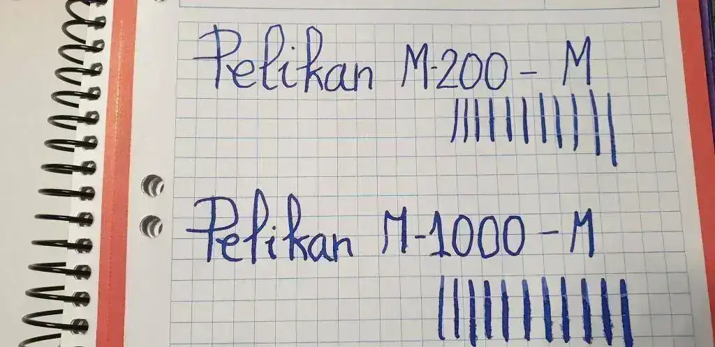 Te dejo una muestra mala y rápida de la comparación de las dos únicas Pelikan que tengo con plumin M. Una M200 con plumín M de acero y de una M1000 con plumín M de 18K , "de los de segunda hornada". La M1005 que tu quieres, monta este ultimo.