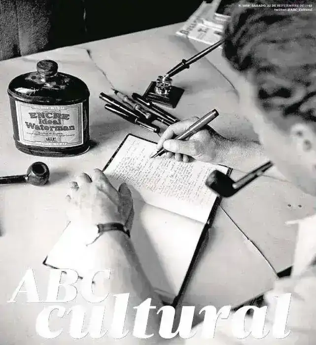 Supongo que será en la edición en papel, porque en internet no encuentro nada de eso.Es que la portada tiene su aquel, gran botellón de tinta Waterman, una Parker Duofold Streamline en la mano, y media docena más de plumas en la mesa !