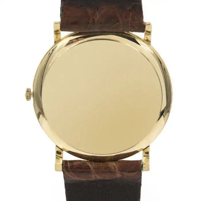 Case: 32 mm x 32 mm – The knurled crown is plated in 18 kt gold.