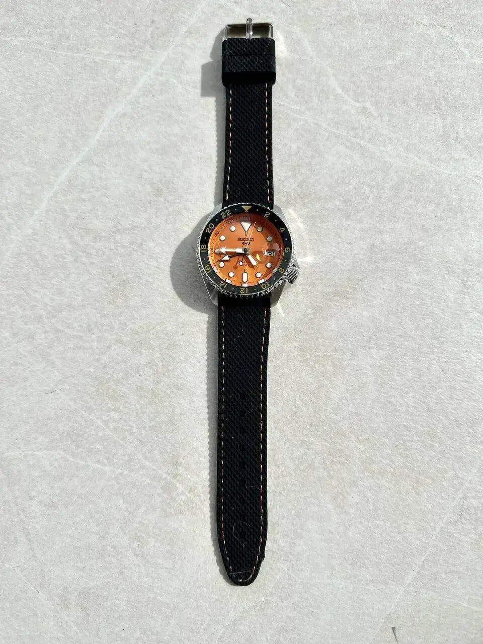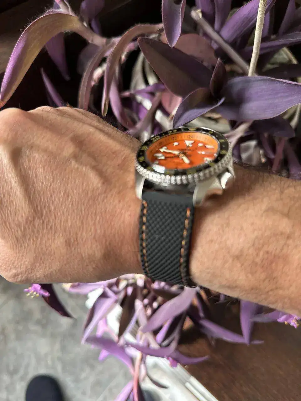 Para mi nuevo Seiko Sport GMT naranja, esta correa de silicona negra y pespunte naranja. He de decir que es comodisima, blandita y a la vez se ve robusta. Y creo que le queda muy bien, teniendo en cuenta que el armis, ni lo he estrenado y que prefiero llevarlo con otra correa.