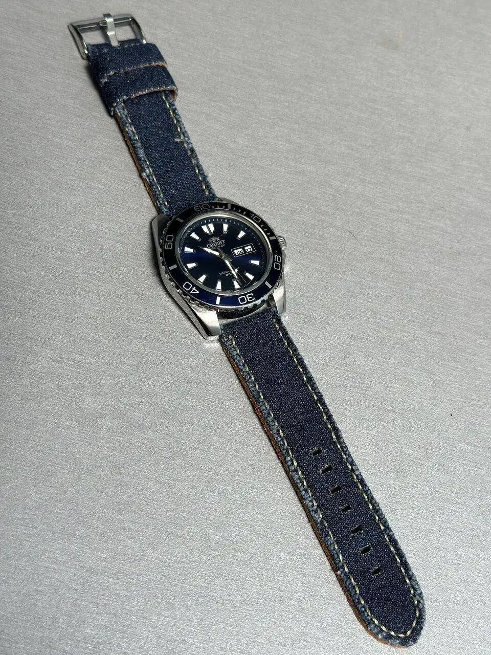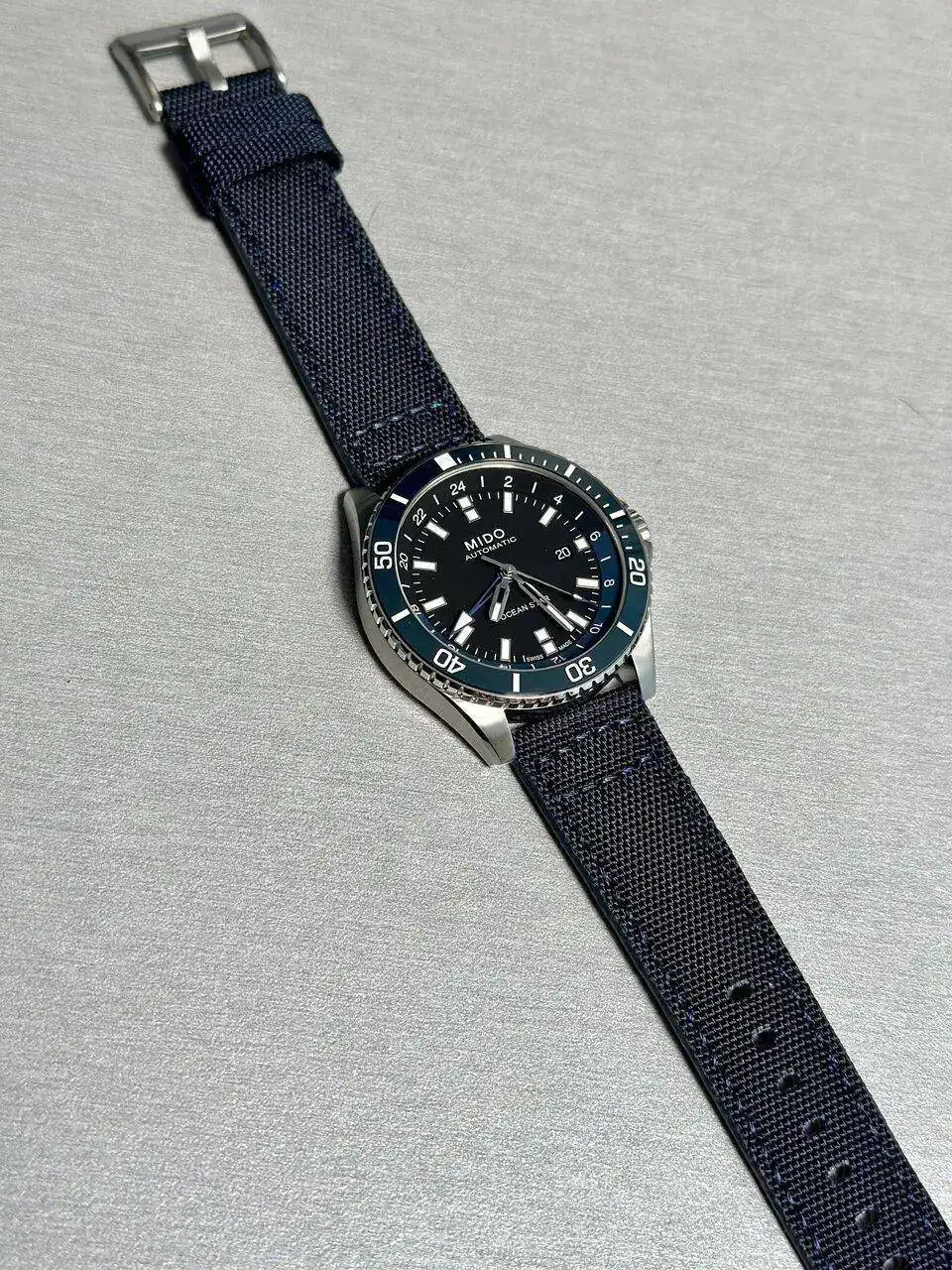 Y por ultimo, casi por necesidad, ya que quería mantener la correa original del MIDO Ocean Star GMT en buen estado y sin embargo, habiendo probado varias, no le encontraba mejor apariencia que con una azul marino; le he comprado al susodicho esta correa de Kevlar y piel en su interior, que es muy comoda y conserva la imagen original.