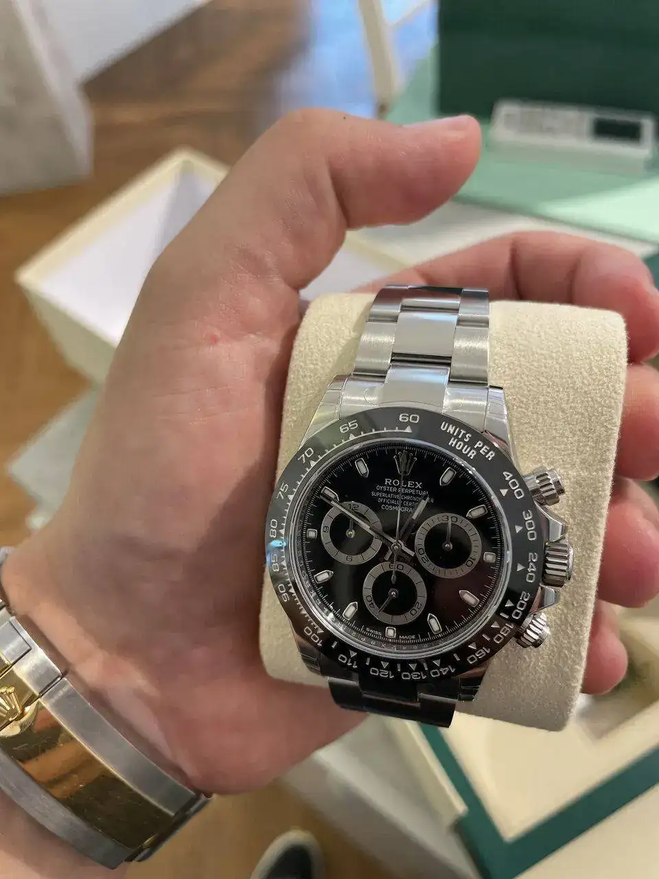 Cuando recibas tu Daytona dentro de 4 o 5 años, los polos se habrán derretio, la humanidad solo comerá tofu y brócoli hevio, sin aceite y sin sal, todo será sostenible, cada uno se sostendrá como pueda, no existirá el dinero y aquella chica tan agradable que te atendió ya no estará, el reloj te lo dará una terfa que tendrá que tener la tienda por cuota de espécimen “raro” o un transgénero, o vete tu a saber qué tipo de engendro te dará el peluco.