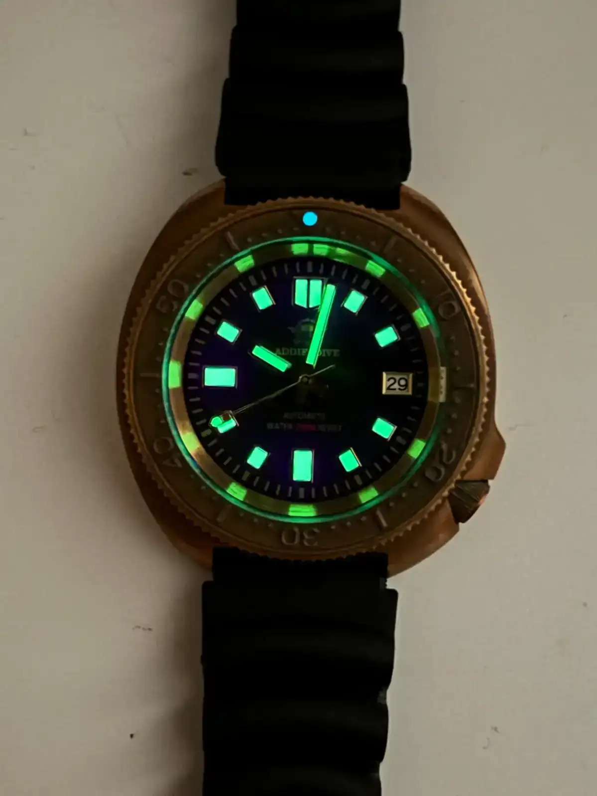 Y respecto del reloj decir que funciona a las mil maravillas. Va en hora, el bisel sigue girando sin problemas, el cristal no tiene ni media marca, la corona enrosca y desenrosca perfectamente, índices y agujas tienen un lumen muy potente... en fin, de momento un 10 para el chino de bronce.